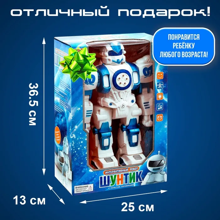 Знакомьтесь с говорящим роботом будущего! Радиоуправляемый робот «Шунтик» – это умный и весёлый друг, который перенесёт вашего ребёнка в мир технологий и развлечений. Голосовое управление, световые и звуковые эффекты, а также русское озвучивание делают его идеальным выбором для мальчиков. С ним можно играть, танцевать и даже разговаривать!