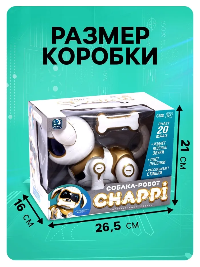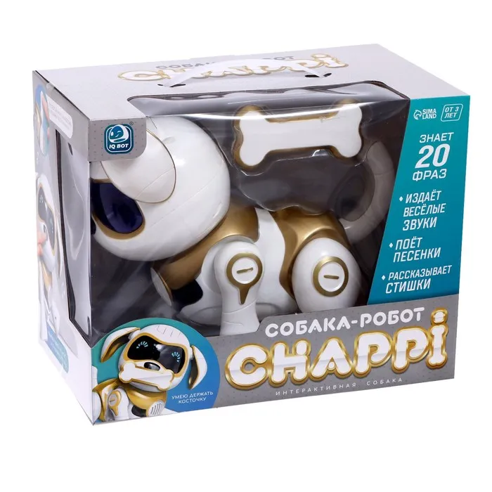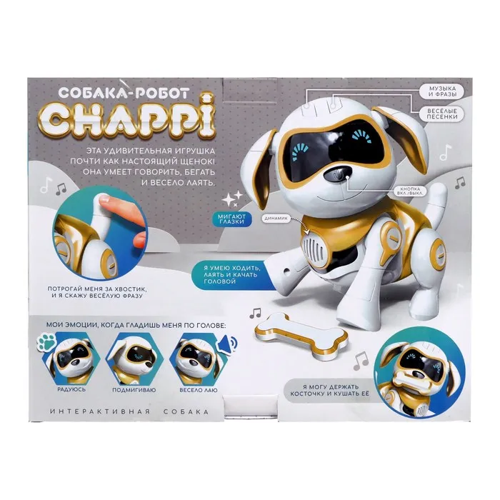 Робот «Чаппи» — прекрасный подарок для детей. Забавный питомец ищет хозяина, который будет любить и заботиться о нём. Милый пёсик умён и талантлив. Он быстро запоминает и превосходно выполняет любые команды, а ещё обожает петь весёлые песни и танцевать. Ребёнок обретёт верного друга и защитника, с которым будет увлекательно проводить время.