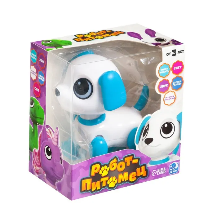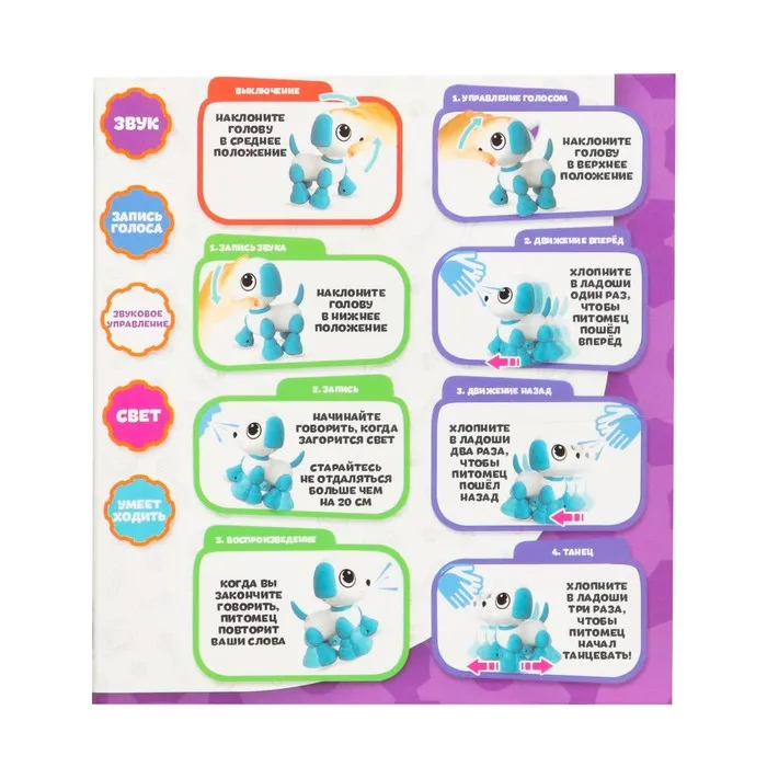 Робот собака «Питомец» IQ BOT, интерактивный: с записью звуков, реагирует на хлопки, звук, свет, на батарейках, фиолетовый — Характеристики
