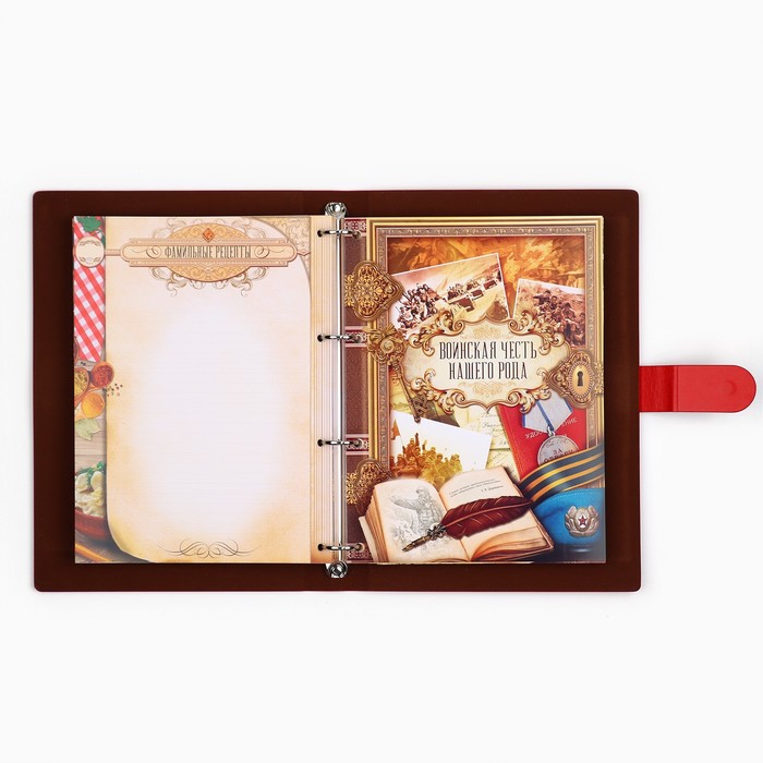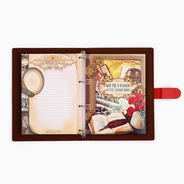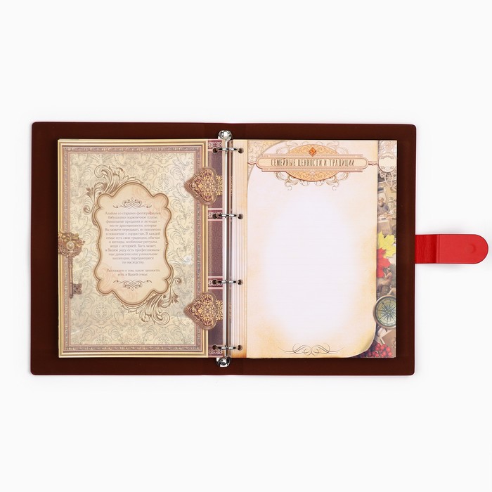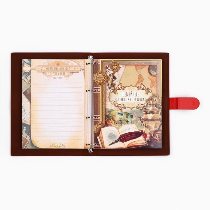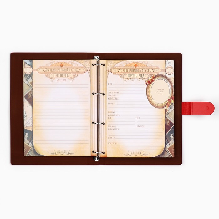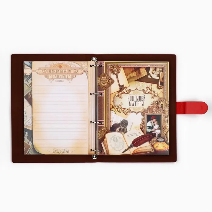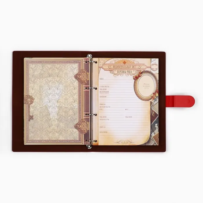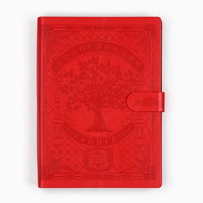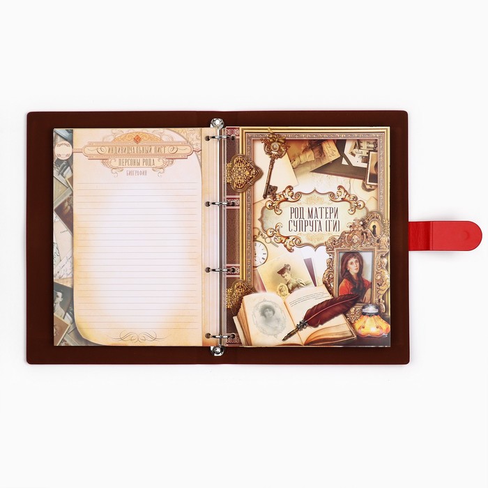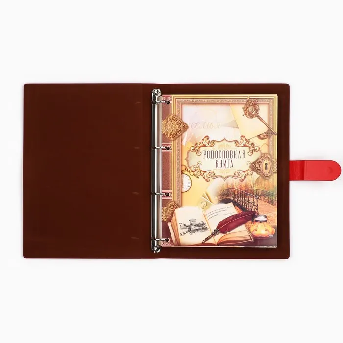Родословная книга на кольцах в переплёте из кожзама содержит 65 листов, лист генеалогического древа формата А2 и лист наклеек для него.