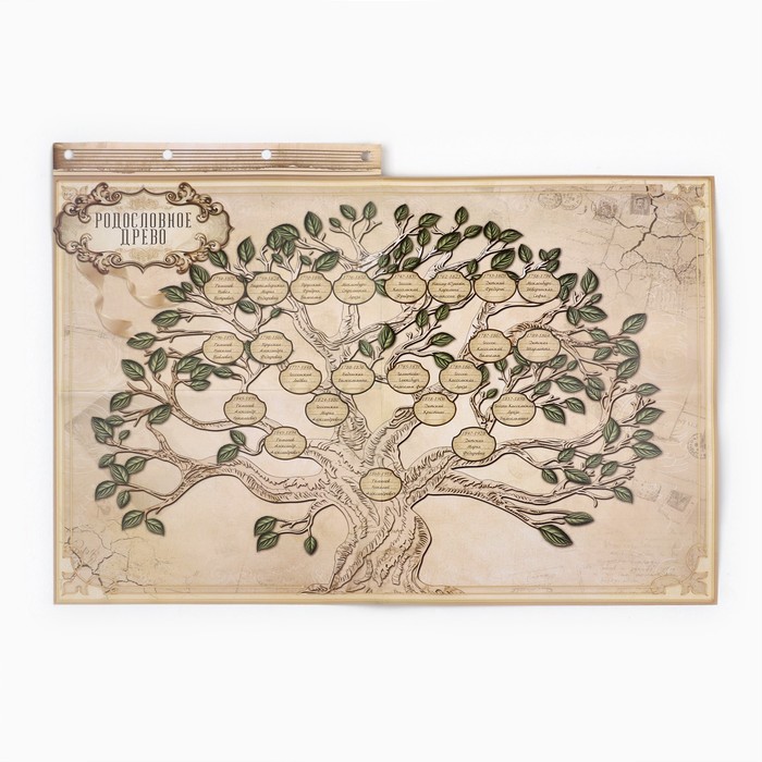 Родословная книга на кольцах в переплёте из кожзама содержит 65 листов, лист генеалогического древа формата А2 и лист наклеек для него. Листы состоят из мелованного картона плотностью 250 гр.