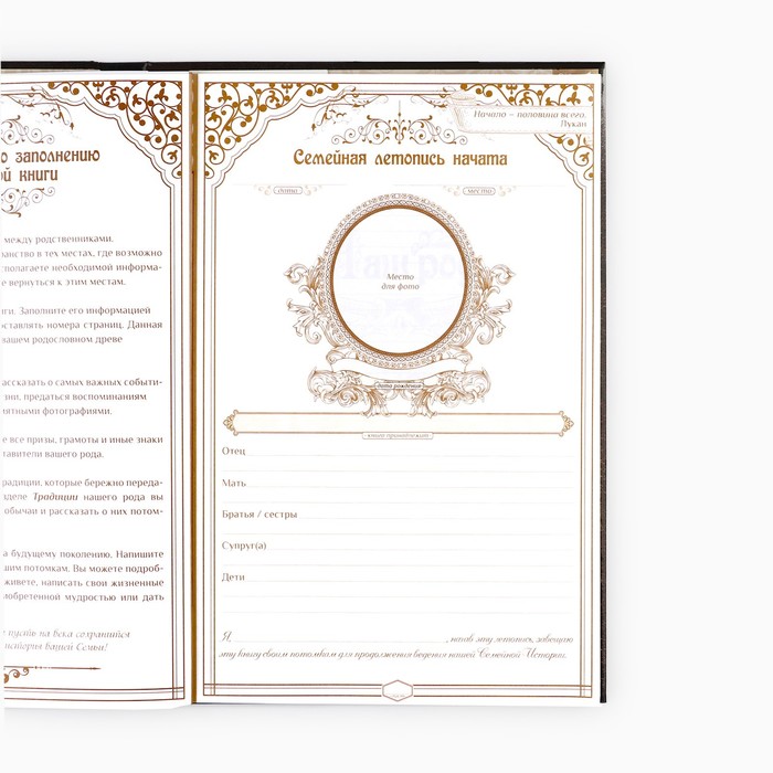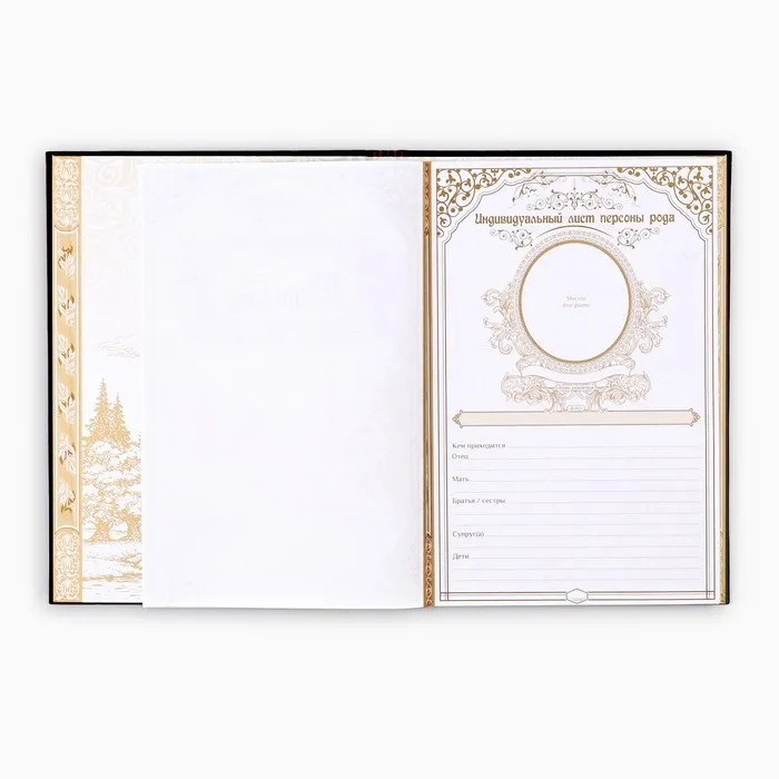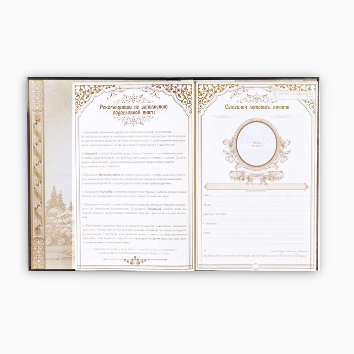 Семья — главное богатство в жизни человека! Сохранить традиции, записать историю поколений и передать их по наследству поможет родословная книга. Она содержит 50 листов (включая инструкции и наименования частей альбома), скреплённых между собой атласной лентой.