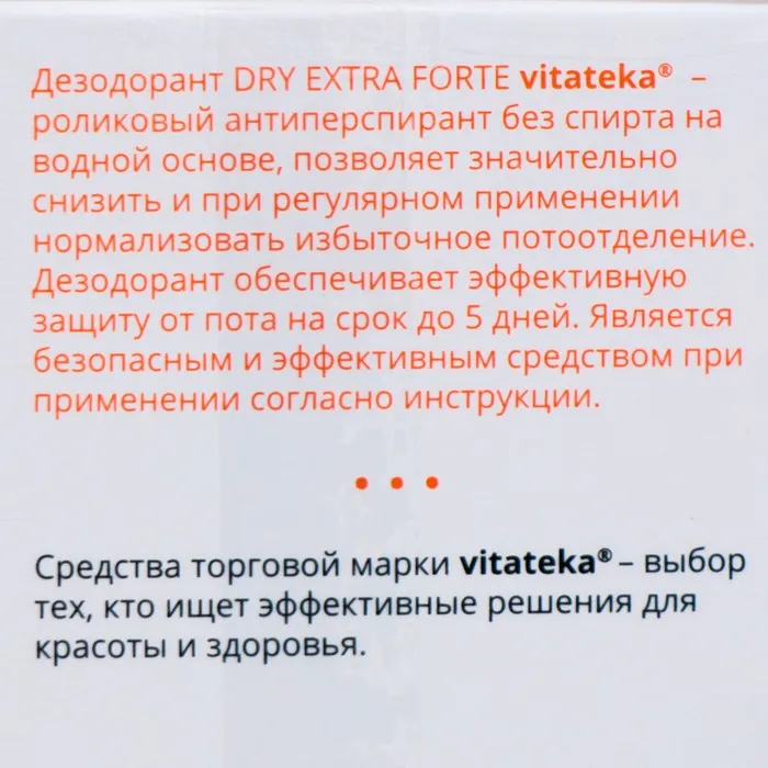 Описание: эффективное средство при повышенной потливости на водняой основе, поможет справиться с проблемой гипергидроза средняей степени людям с чувствительной кожей, а также тем, кто не использует средства с содержанием спирта. Антиперспирант также помогает избавиться от повышенного потоотделения при нарушениях вегетативной нервной системы, эмоциональном дисбалансе, нервном напряжении, стрессе. Защищает от пота и неприятного запаха на срок от 5 до 7 дняей.