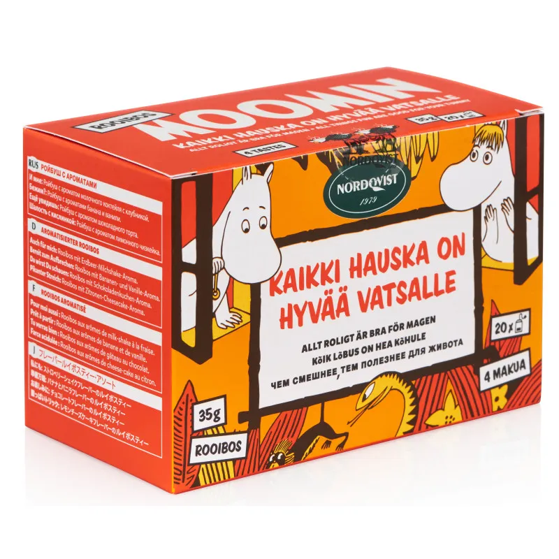Muumi Rooibos смесь – это радостный набор безкофеиновых напитков на основе красного чая Ройбуш. Четыре вкуса, которые подарят вам удовольствие. В упаковке 20 пакетиков, всего 35 г. Мы постоянно обновляем информацию о продукции, но настоятельно рекомендуем всегда проверять данные на упаковке.