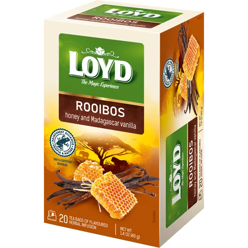 Чай ройбуш Loyd, приправленный медом и мадагаскарской ванилью, подарит вам неповторимый вкус и аромат. Идеальный выбор для тех, кто ценит натуральные ингредиенты и изысканный вкус. Упаковка содержит 20 пакетиков, что обеспечивает долгие минуты наслаждения.