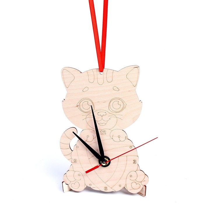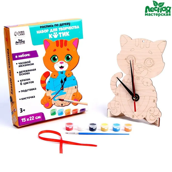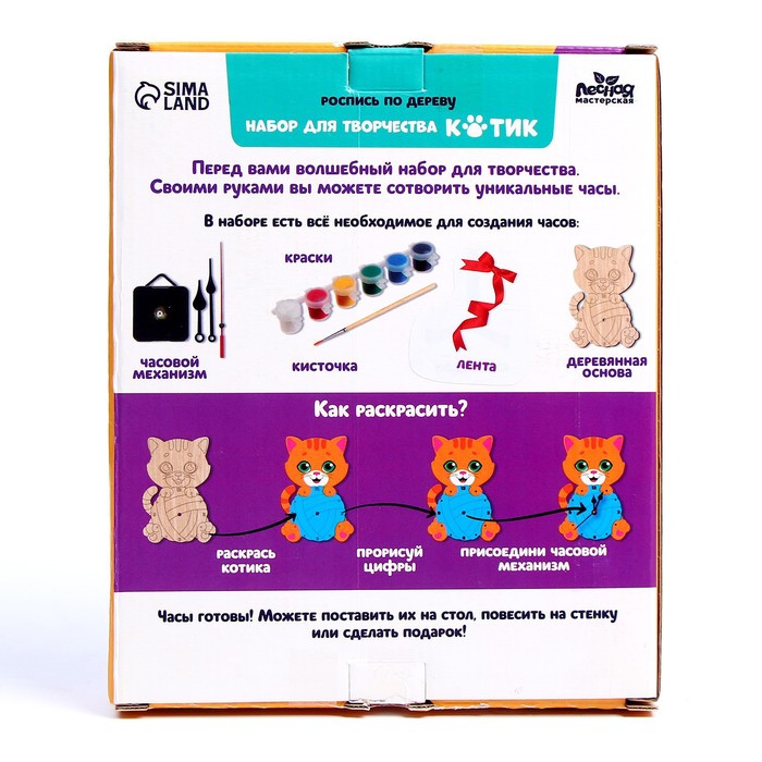 - В комплект входит деревянная основа для часов, акриловые краски, кисточка, поставка, лента и часовой механизм.
