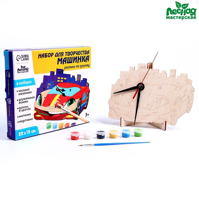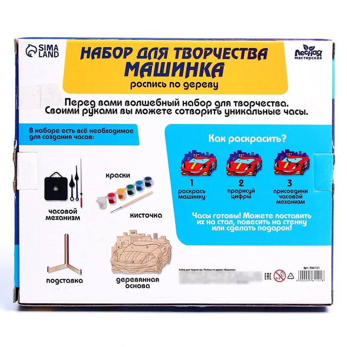 - В комплект входит деревянная основа для часов, акриловые краски, кисточка, поставка, лента и часовой механизм.