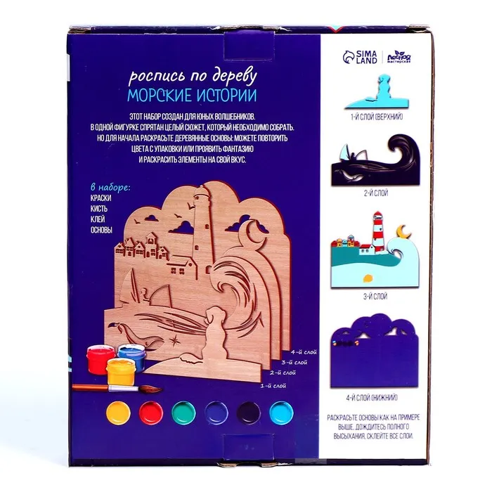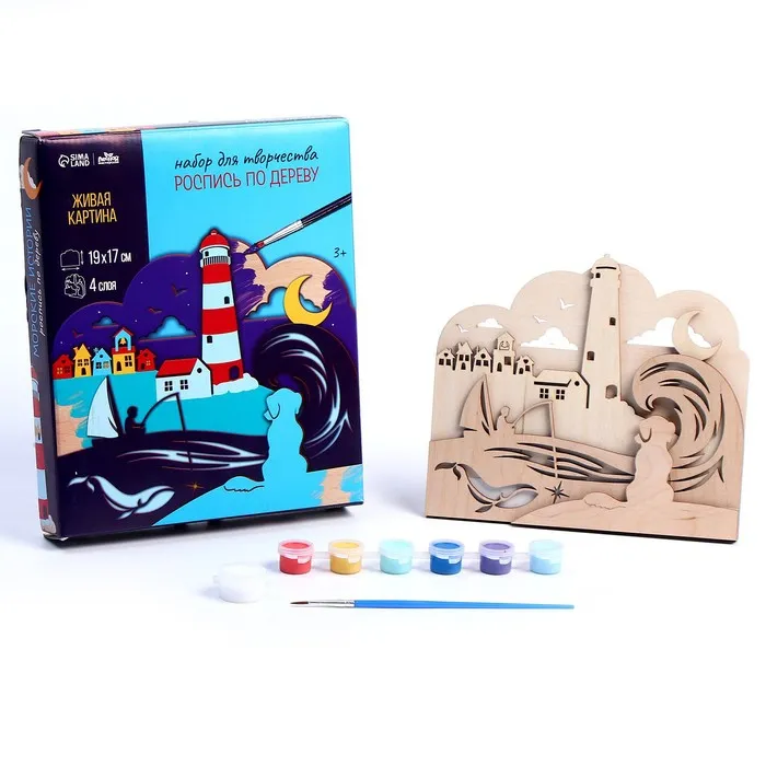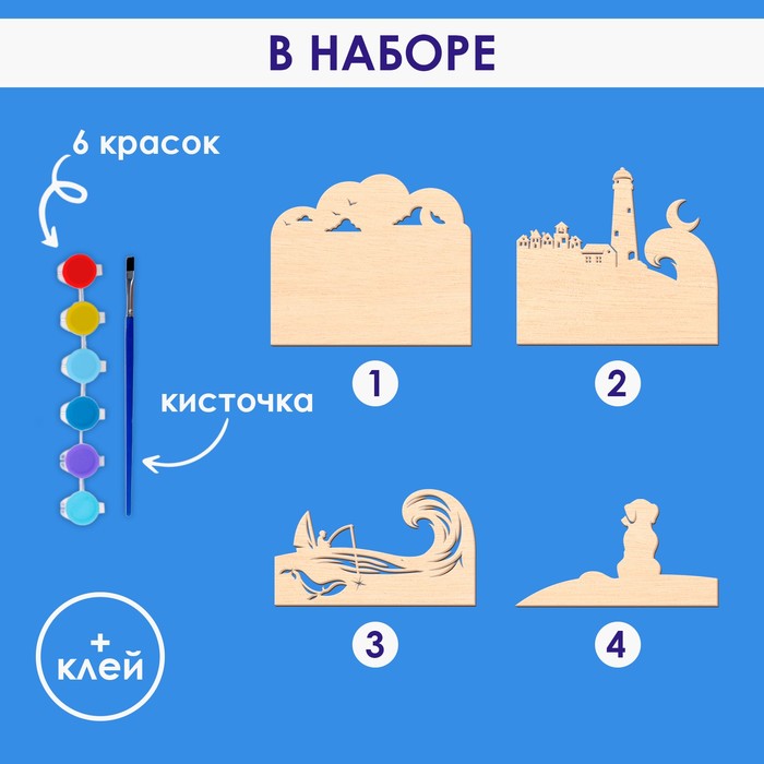 - В комплект входят деревянные заготовки, краски и кисточка, для прочности и объёмности картинки используйте клей при сборке.