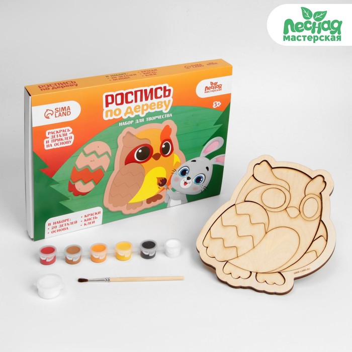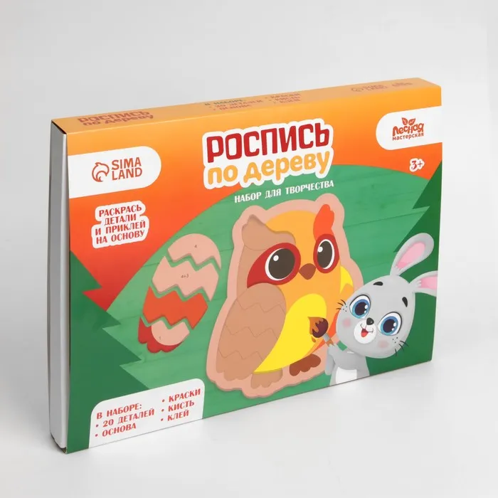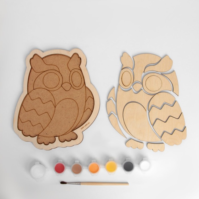 - В комплект входят деревянные заготовки, краски, кисточка и клей.