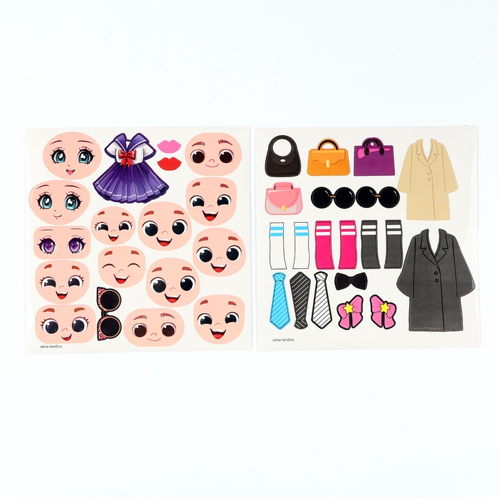 - Оформи лица наклейками из набора! Разные глаза? А может большой нос? Или улыбающийся рот?