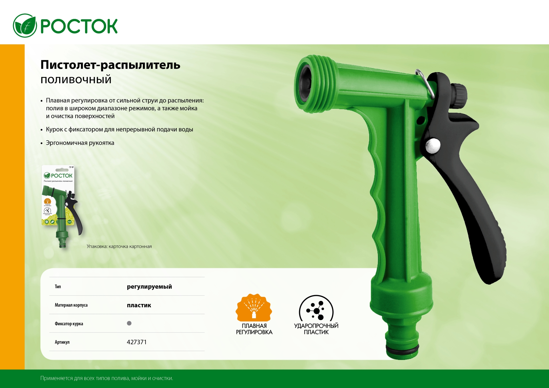 Поливочные наконечники и пистолеты-распылители РОСТОК надёжны и долговечны. Обеспечивают быстрое подключение к поливочной системе и долговременный полив, изготовлены из ударопрочного пластика.