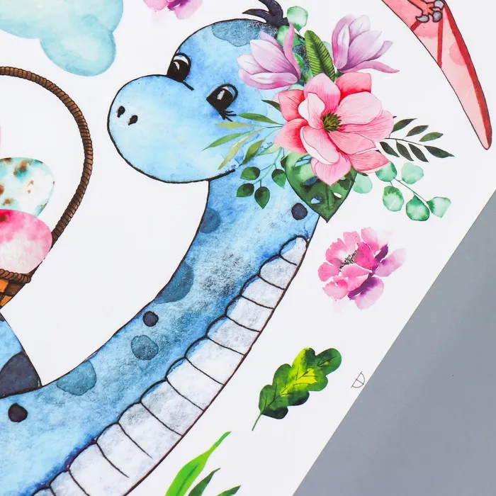 Ростомер детский «Динозаврик и корзина с цветами», наклейка интерьерная, декор на стену, панно, 50×70 см — Характеристики