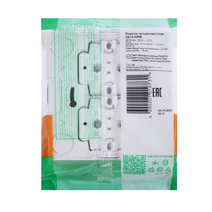Розетка четверная SE «Этюд», 250 В, 16 А, IP20, накладная, с заземлением, шторки, белая, PA16-208B — Характеристики