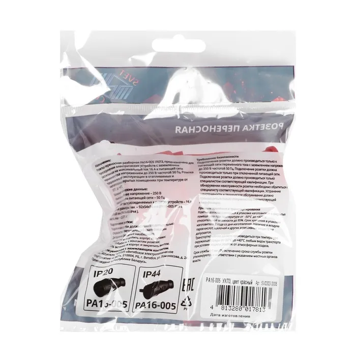 Розетка переносная 16-005, 16 А, 250 В, IP44, с з/к, с заглушкой, каучук, красная — Характеристики