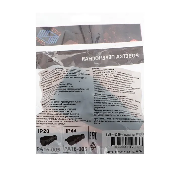 Розетка переносная РА 16-005, 16 А, 250 В, IP20, с з/к, без заглушки, каучук, черная — Характеристики