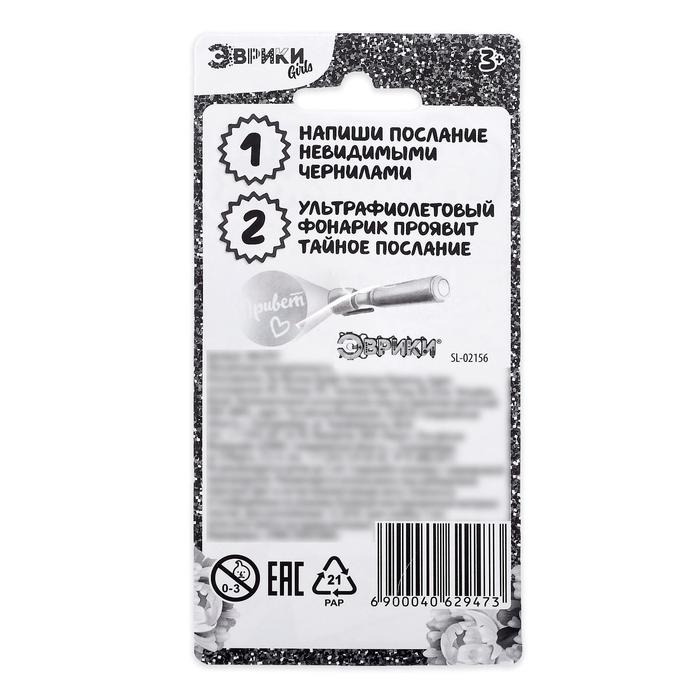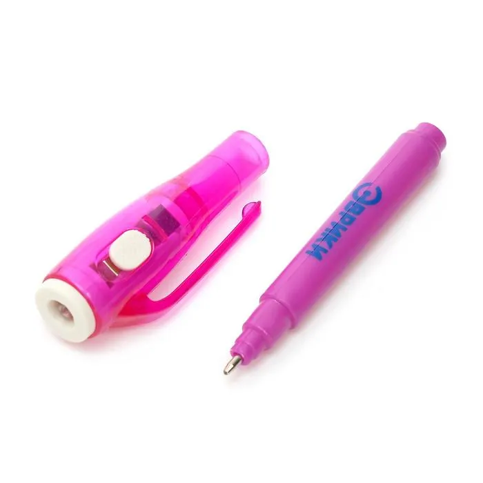 Чернила остаются незаметными при обычном освещении, но стоит направить на них свет фонарика — и рисунки, надписи или загадки проявляются. Это отличный способ придумать шифрованные послания, украсить личный дневник или создать уникальные узоры.