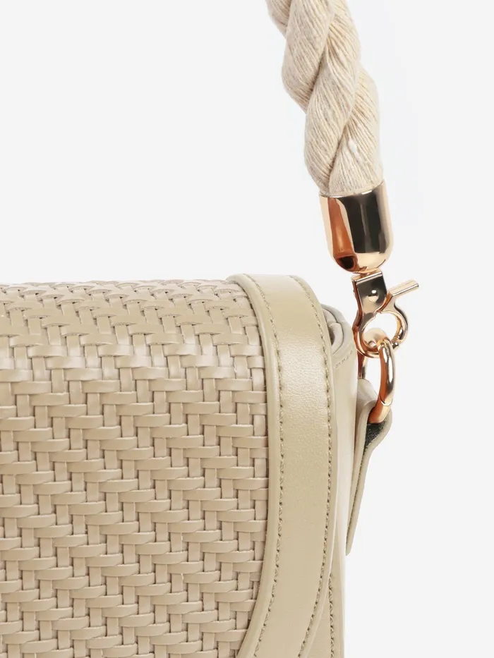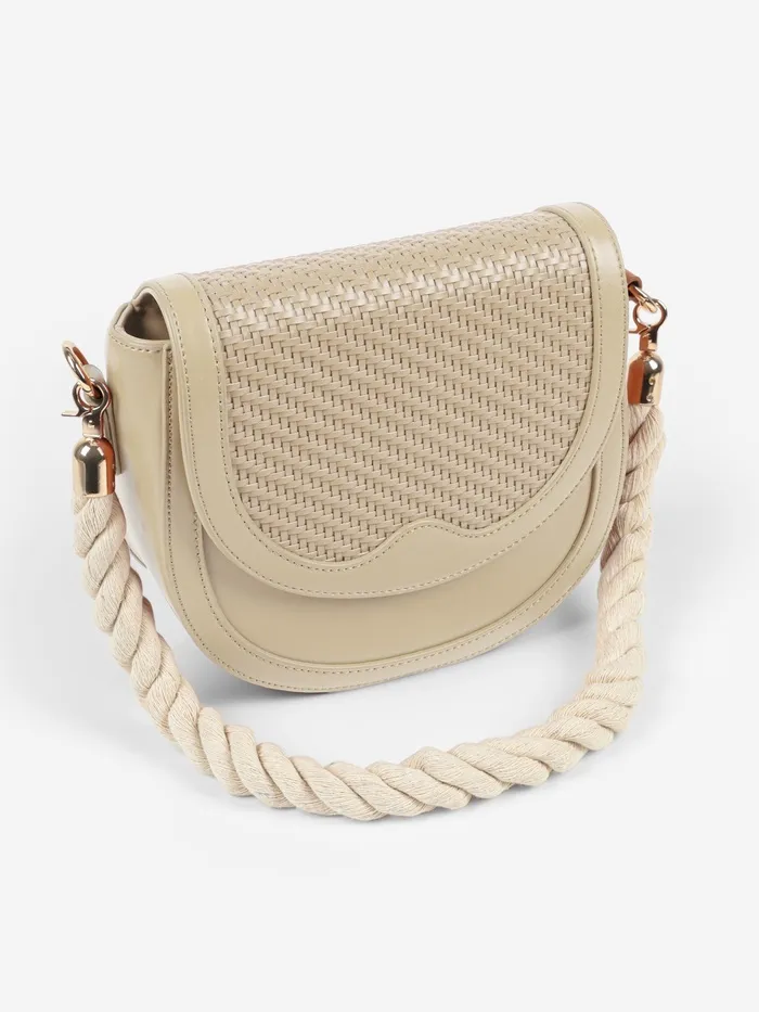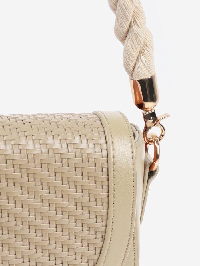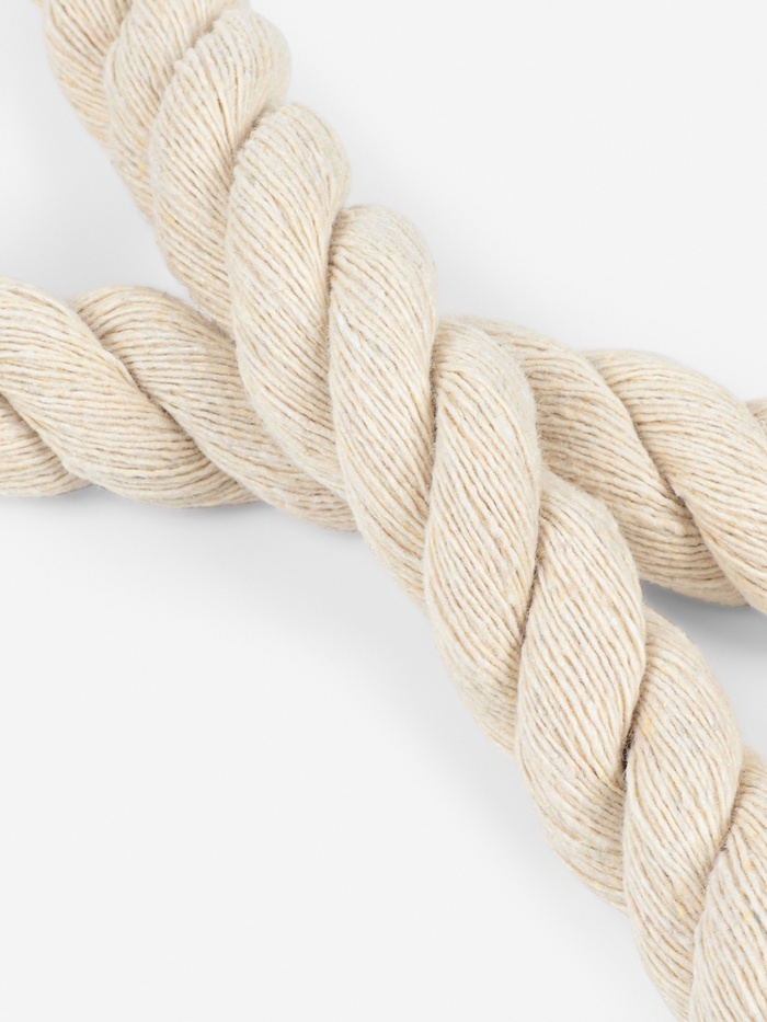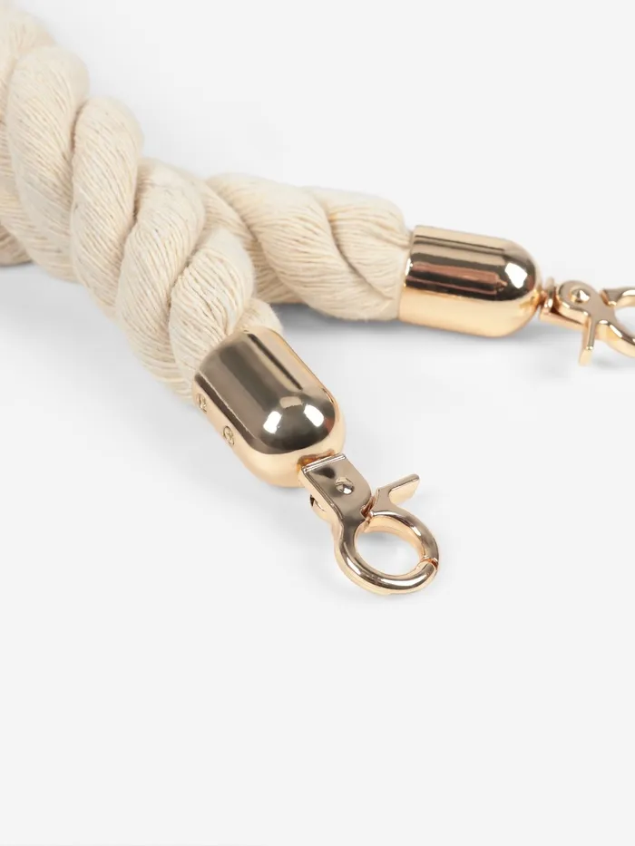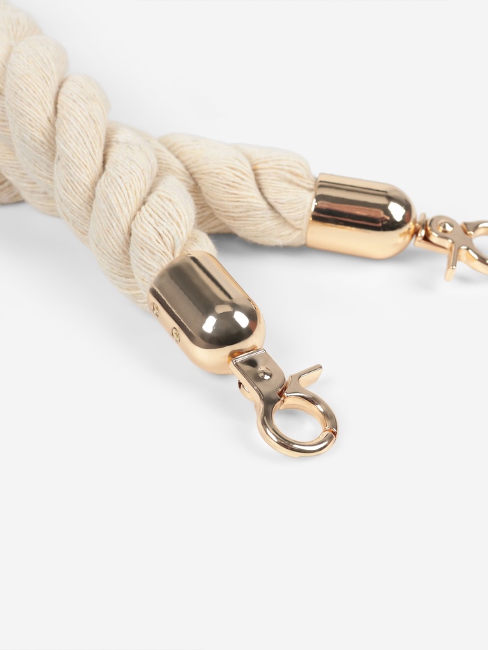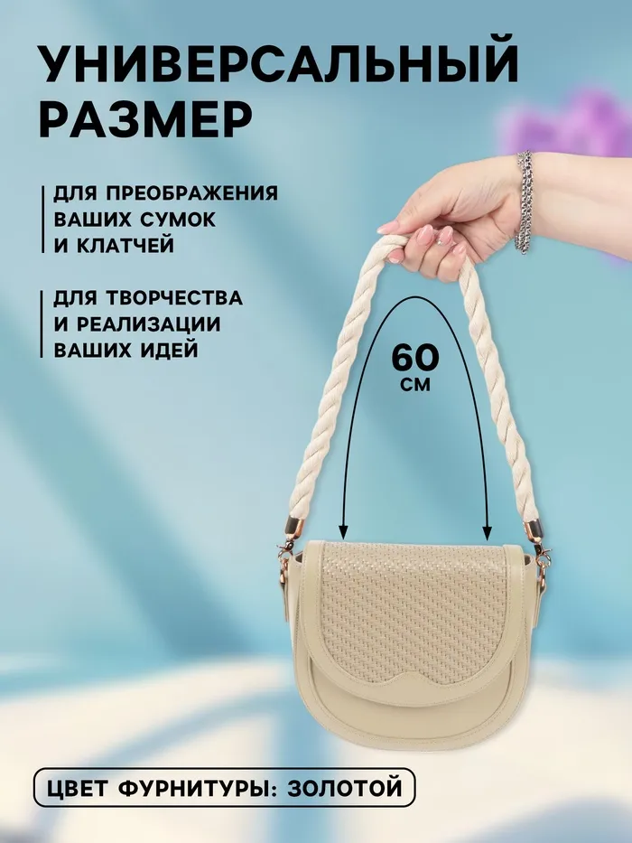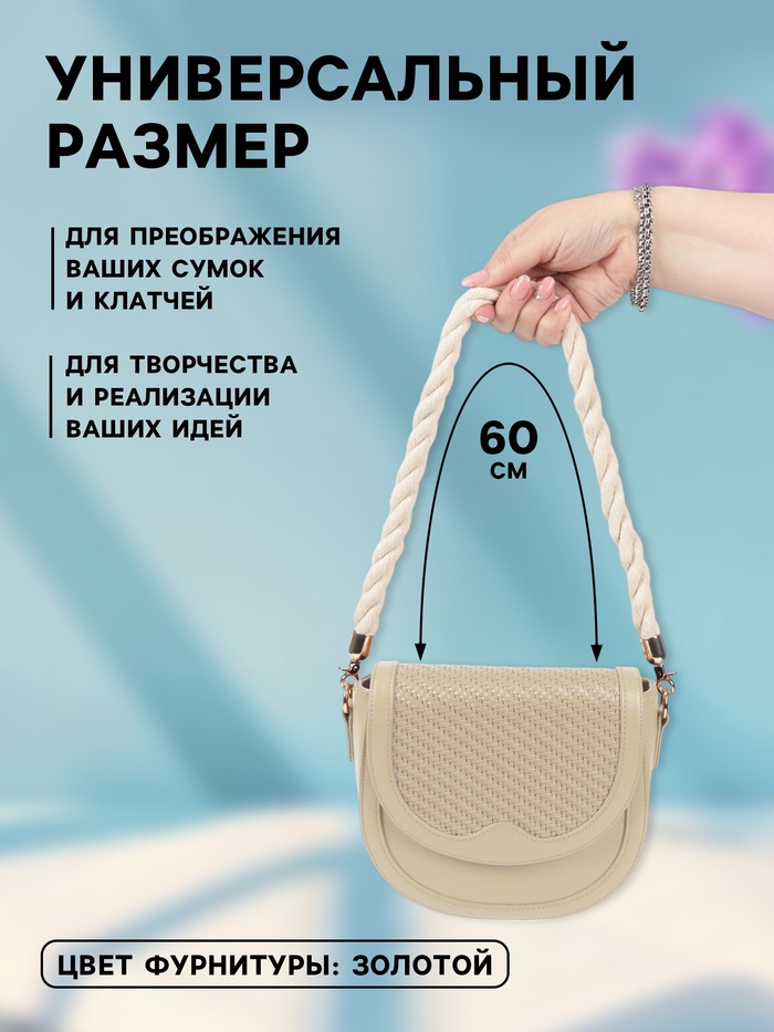 Короткий канатный ремешок с золотистыми карабинами — элегантное решение для компактных сумок. Плотная плетеная структура из полиэстера в кремовом оттенке сочетает легкость и прочность. Длина 60 см идеальна для ношения в руке или на сгибе локтя.
