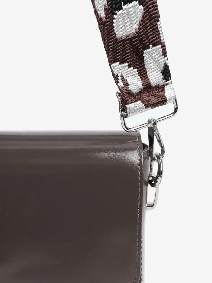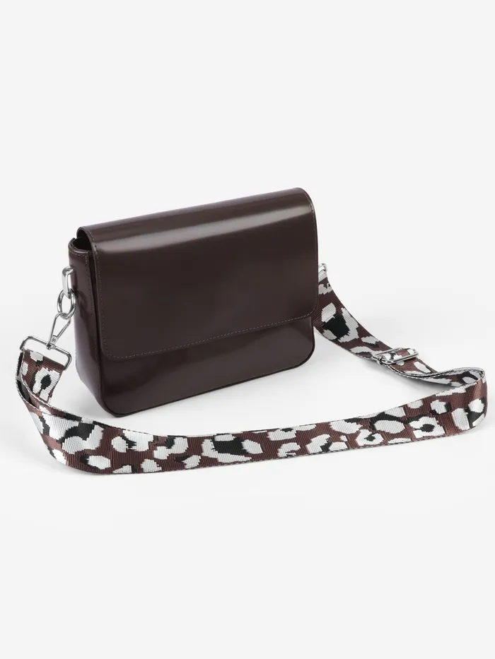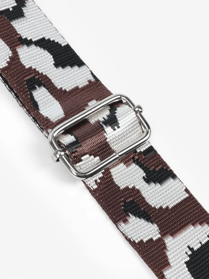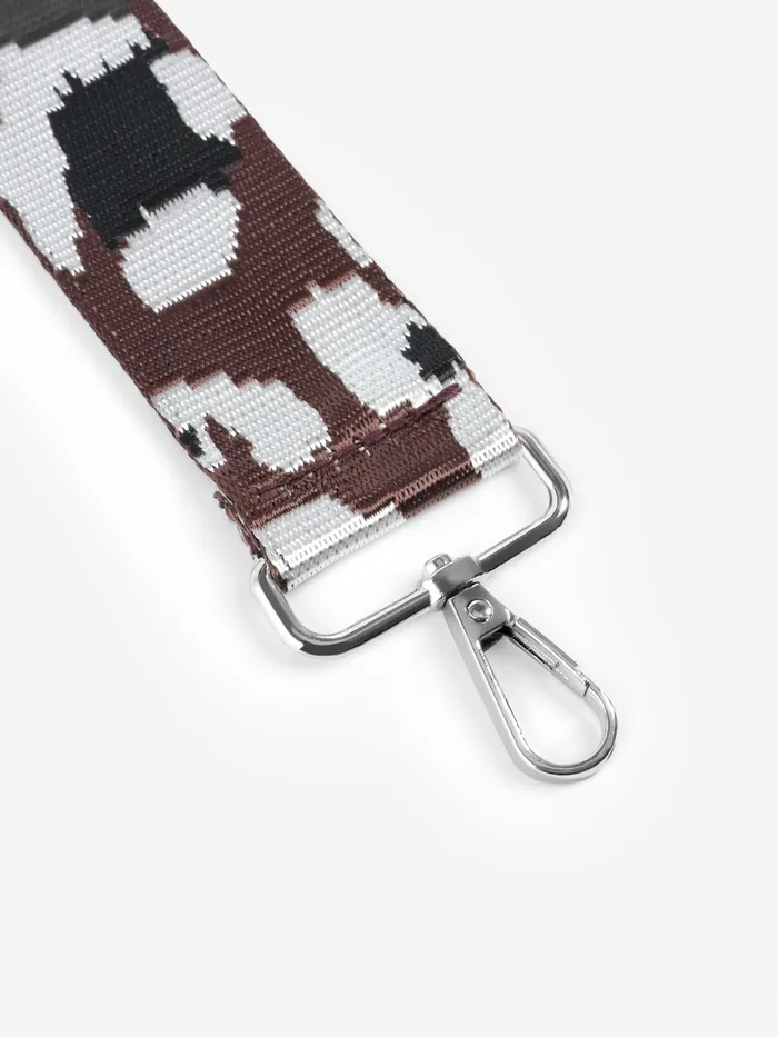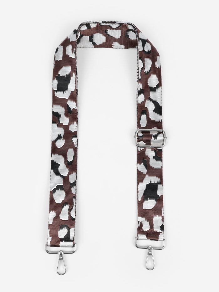 Элегантный ремень с леопардовым принтом — стильная альтернатива для вашей сумки. Коричневый фон с эффектным молочным узором и серебристыми карабинами создает благородный контраст, сохраняя при этом универсальность. Длина 139 см удобна для ношения через плечо.