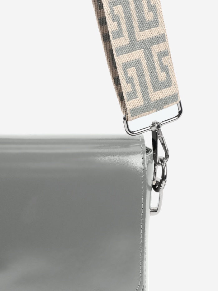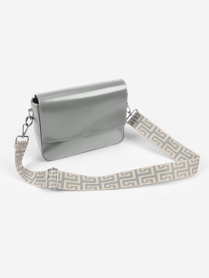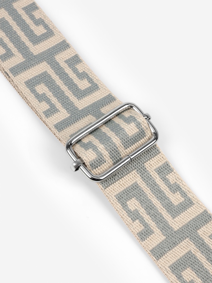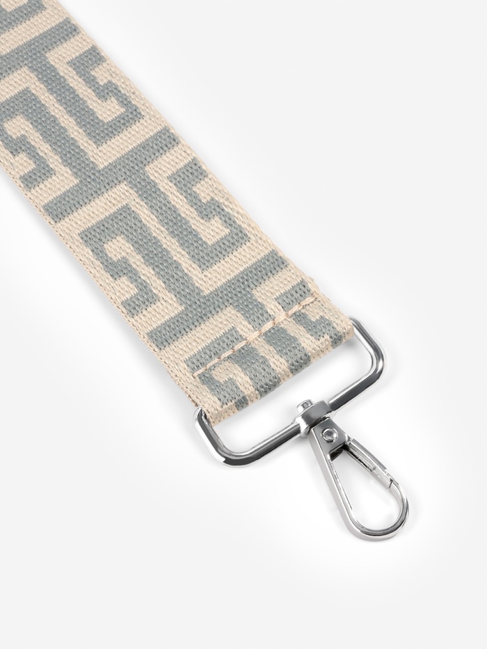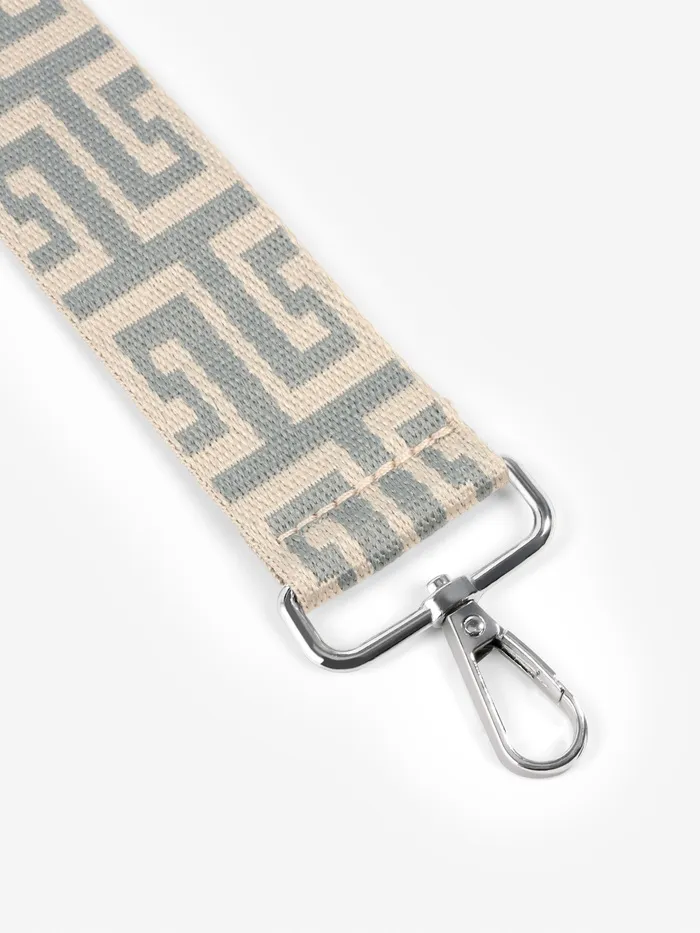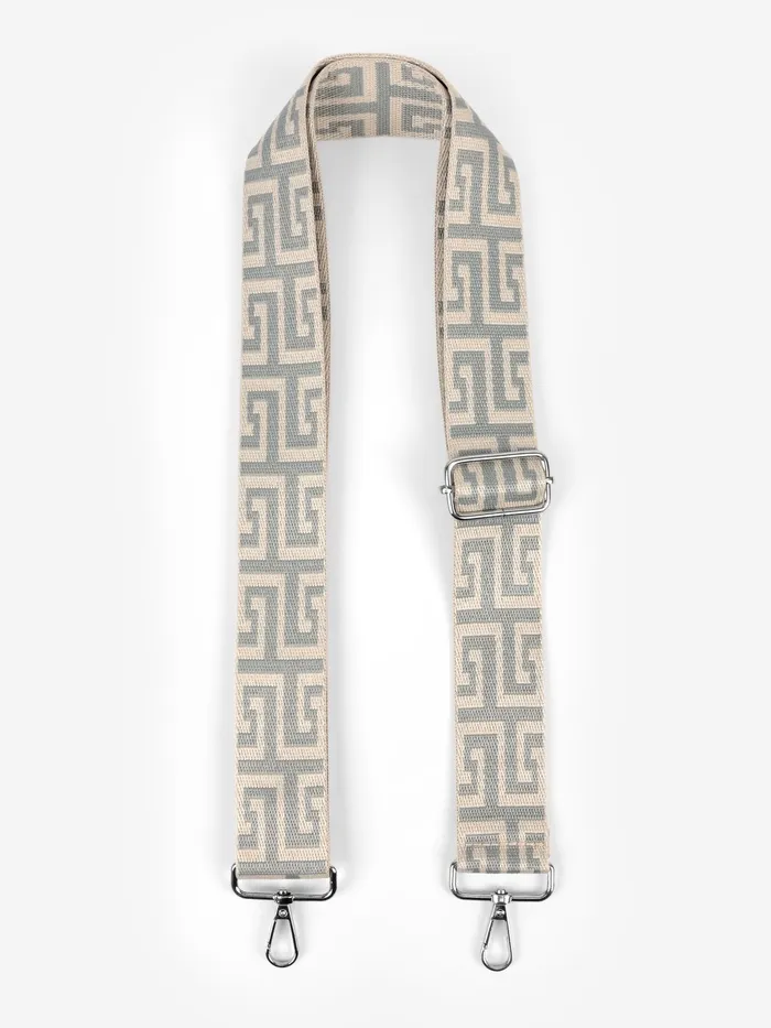 Элегантный ремень с греческим орнаментом придаст вашей сумке средиземноморский шарм. Сдержанная серо-молочная гамма с серебристыми карабинами создает благородный образ, а длина 139 см обеспечивает удобное ношение через плечо.