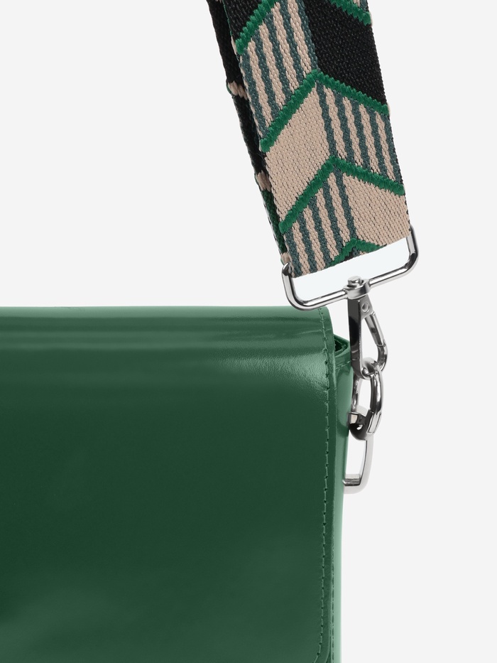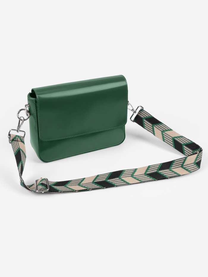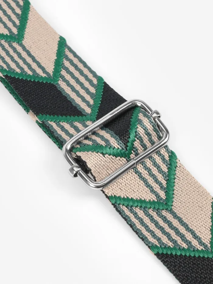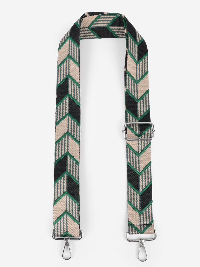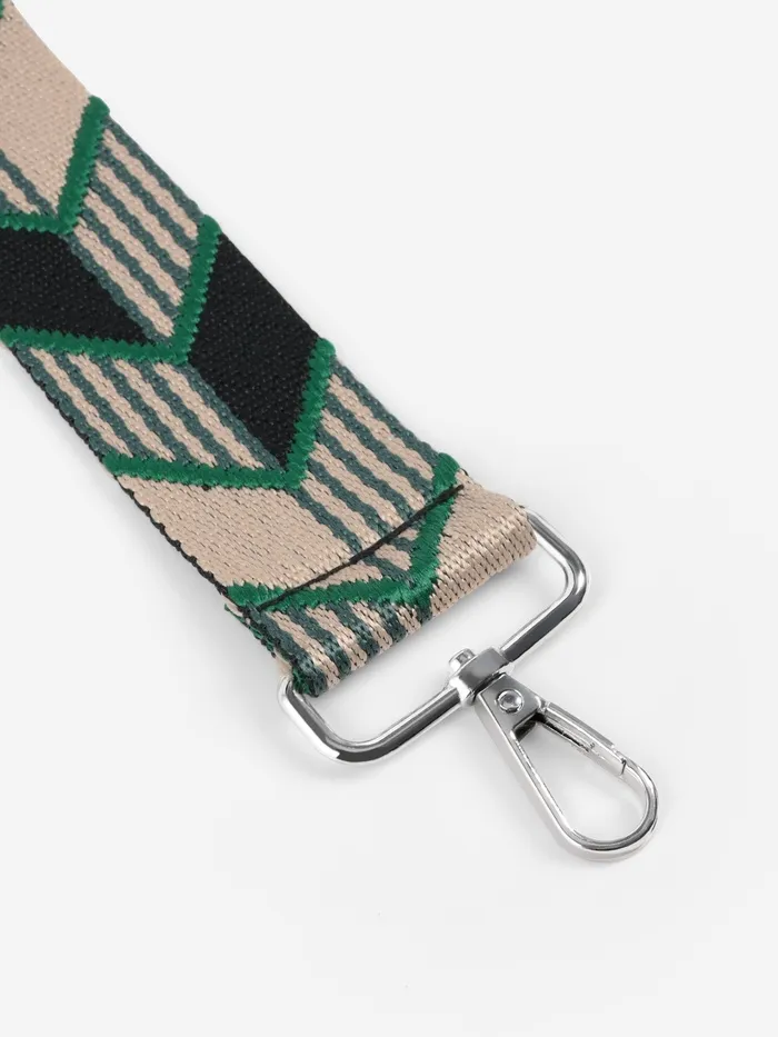 Динамичный ремень с геометрическим узором «стрелки» — стильное обновление для вашей сумки. Контрастное сочетание зеленого и черного с серебристыми карабинами создает современный акцент, а длина 139 см удобна для ношения через плечо.