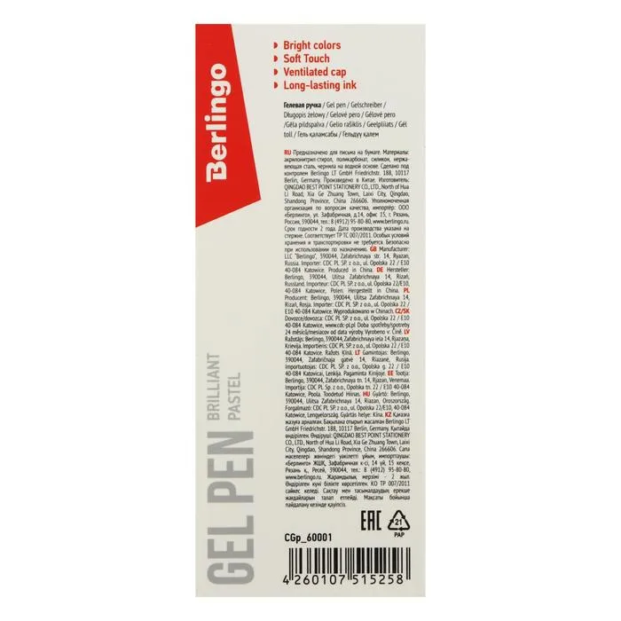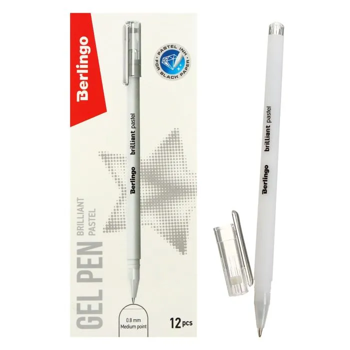 Гелевая ручка Berlingo Brilliant Pastel c белым цветом чернил станет настоящей находкой для творческих натур. Ручка изготовлена с использованием корейских чернил, которые обеспечивают высокое качество письма и срок годности 2 года. Бархатистое покрытие Soft touch создаёт дополнительный комфорт при использовании. Цвет корпуса соответствует цвету чернил. Расширяя возможности для воплощения неординарных задумок, производитель сделал ручку, подходящей для рисования и письма на чёрной бумаге. Диаметр пишущего узла 0,8 мм обеспечивает мягкость письма и насыщенность цвета. Толщина линии письма составляет 0,6 мм, длина линии письма - 450 метров. Цвет чернил: белый, Толщина линии письма: 0,6 мм, Длина письма: 450 м, Цвет корпуса: золотой.