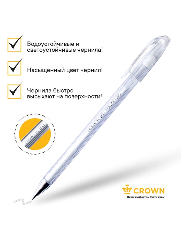 Гелевая белая ручка Crown Hi-Jell Pastel – надежная ручка для воплощения всех художественных идей. Диаметр пишущего узла - 0,8 мм, благодаря чему получается насыщенная линия. В групповой упаковке 12 штук. Она идеально подойдет для скрапбукинга, леттеринга или рисования. Корпус сделан из высококачественного пластика, который при поломке не оставляет мелких осколков. Корейские гелевые чернила на водной основе обладают высокой светостойкостью и водостойкостью, мгновенно высыхают, не смазываются. Благодаря гелеобразным чернилам и специальной технологии пишущего узла гелевые ручки Crown Hi-Jell Pastel обеспечивают мягкое и комфортное письмо. Равномерно измельченный пигмент в составе чернил позволяет писать ярко без пропусков и исключает царапины на бумаге.