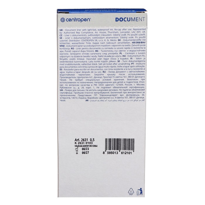 Ручка капиллярная, 0.5 мм, Centropen "Document" 2631, черная, длина письма 500 м, картонная упаковка — Характеристики