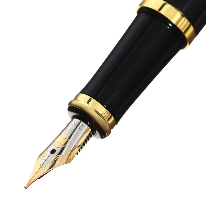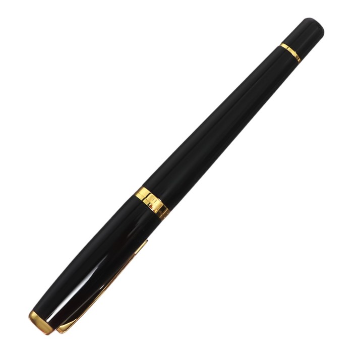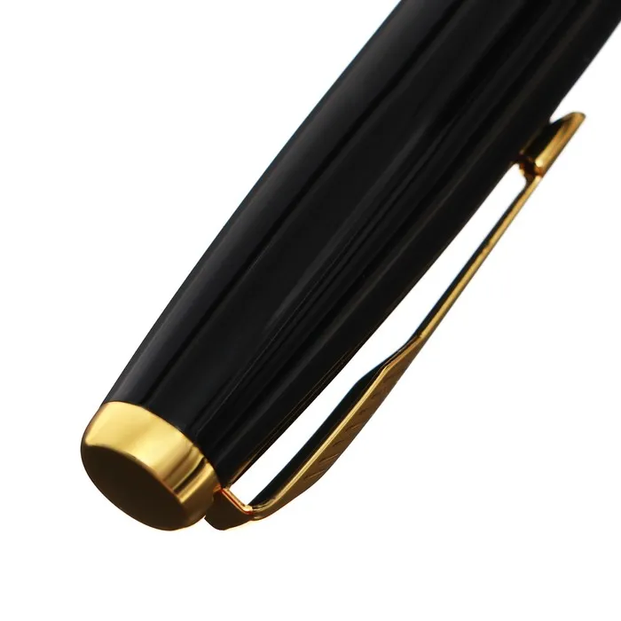 Роскошная модель перьевой ручки с корпусом из металла черного цвета и золотистыми деталями.