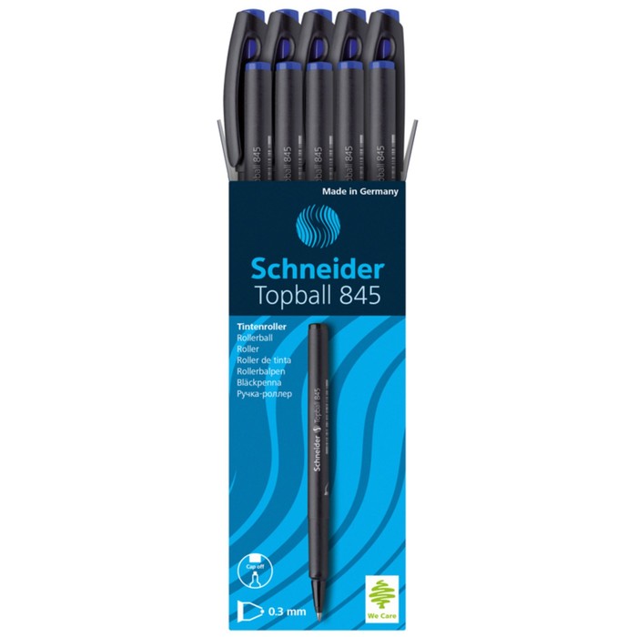 Ручка-роллер Schneider TopBall 845 с круглым стильным чёрным корпусом и пластиковым клипом. Диаметр пишущего узла ручки составляет 0,5 мм, толщина линии письма – 0,3 мм. Длина письма до 2000 метров. Удобный чернильный одноразовый роллер. Цвет элементов корпуса соответствует цвету чернил. Письменные принадлежности Schneider разрабатываются и производятся только в Германии