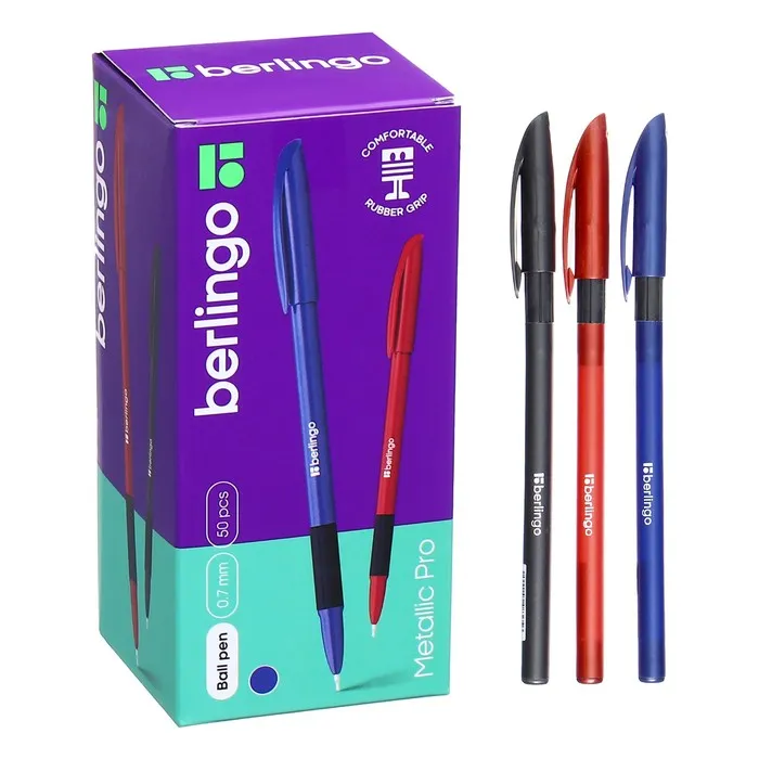 Шариковая ручка Berlingo Metallic Pro представлена в 3-х насыщенных цветах с эффектом металлик. У ручки есть вентилируемый колпачок, который безопасен при использовании детьми, и пластиковым клипом, позволяющим закрепить ручку там, где удобно. Резиновый грип предотвращает скольжение пальцев при письме. Специальный пишущий узел и чернила пониженной вязкости обеспечивают супермягкое письмо. Диаметр пишущего узла составляет 0,7 мм, благодаря чему ручка прекрасно подходит для любого стиля письма. Цвет чернил: синий, Толщина линии письма: 0,5 мм, Длина письма: 950 метров, Цвет корпуса: микс из 3-х цветов,.