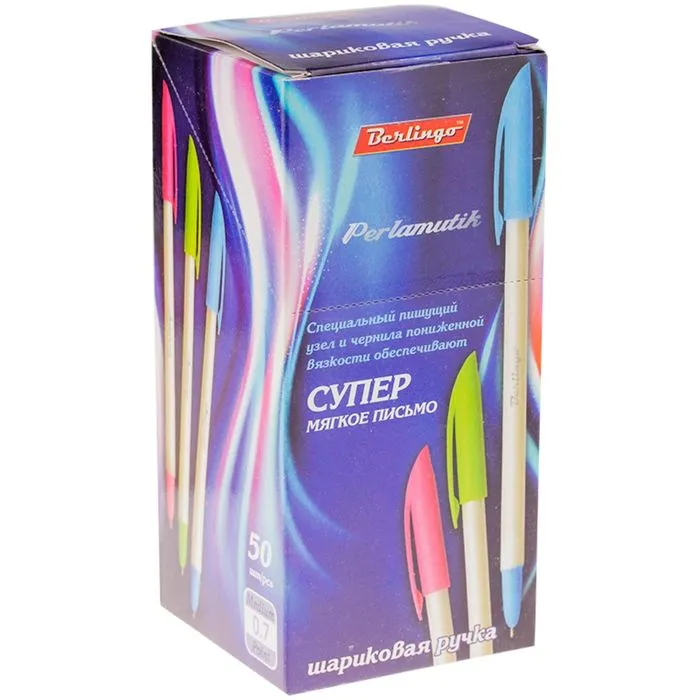 Одноразовую шариковую ручку Berlingo Perlamutik будет точно легко найти на столе или в ящике благодаря контрастному сочетанию эффекта нежного перламутра и ярких цветов в дизайне корпуса и вентилируемого колпачка. Удобный пластиковый клип поможет закрепить ручку на планшете или ежедневнике. Специальный пишущий узел и чернила пониженной вязкости обеспечивают супермягкое письмо. Цвет чернил – синий. Диаметр пишущего узла составляет 0,7 мм, благодаря чему ручка идеально подходит для быстрого стиля письма. Толщина линии письма 0,5 мм, а длина линии письма – 950 м. Цвет чернил: синий, Толщина линии письма: 0,5 мм, Длина письма: 950 м, Цвет корпуса: микс из 3-х цветов с эффектом перламутра.