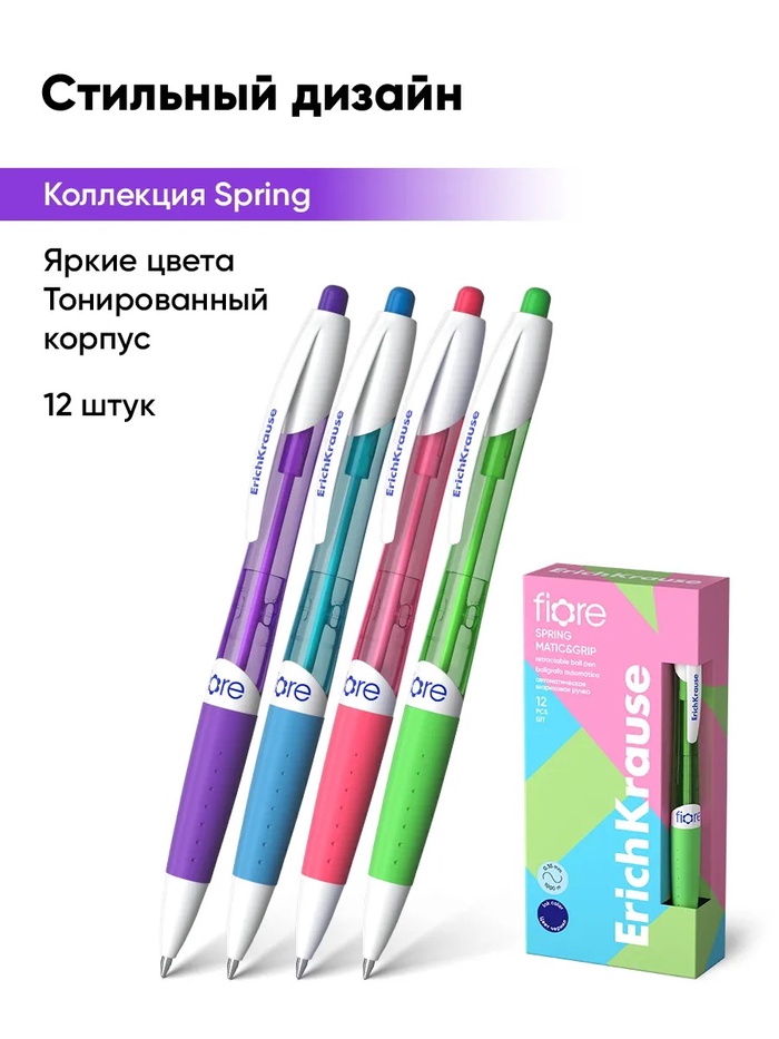 Автоматическая шариковая ручка Matic&Grip со стандартным типом пишущего узла и заменяемым стержнем. Ручка имеет полупрозрачный корпус ярких неоновых цветов с удобной грип-зоной из резины. 5-канальный пишущий узел с диаметром шарика 0.7 мм в сочетании с быстросохнущими чернилами обеспечивает мягкое и быстрое письмо. Длина непрерывной линии составляет 1000 м при толщине 0.35 мм, что является высоким показателем в своей категории. Ручка Fiore - популярная женская модель с ярким дизайном.