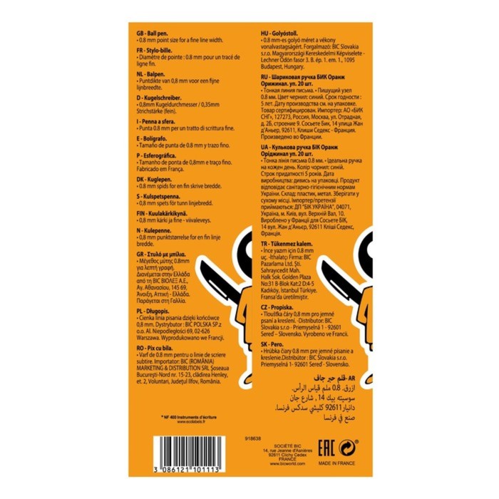 • Ручка шариковая, BIC Orange, узел 0.8 мм, чернила синие, мягкое экономичное тонкое письмо, оранжевый корпус — Характеристики
