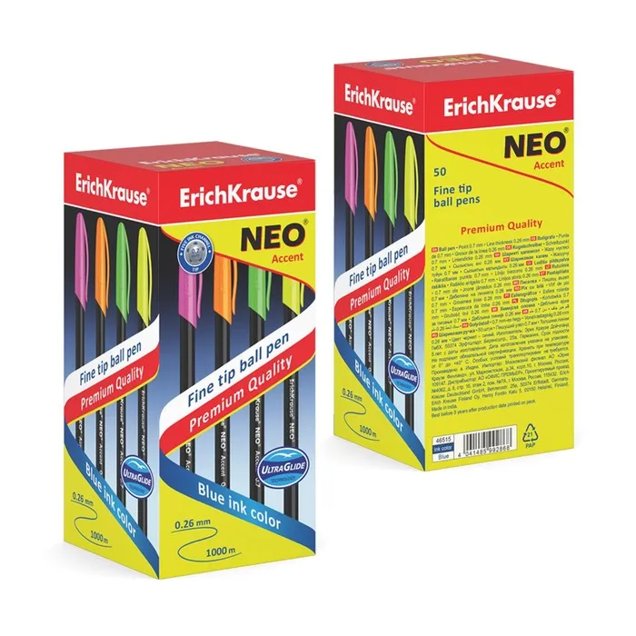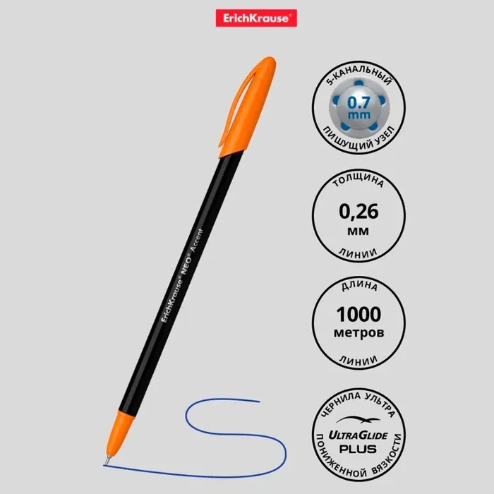 Ручка шариковая ErichKrause Neo Accent, игольчатый узел 0.7 мм, чернила синие, длина линии письма 1000 метров, МИКС — Характеристики