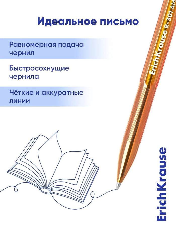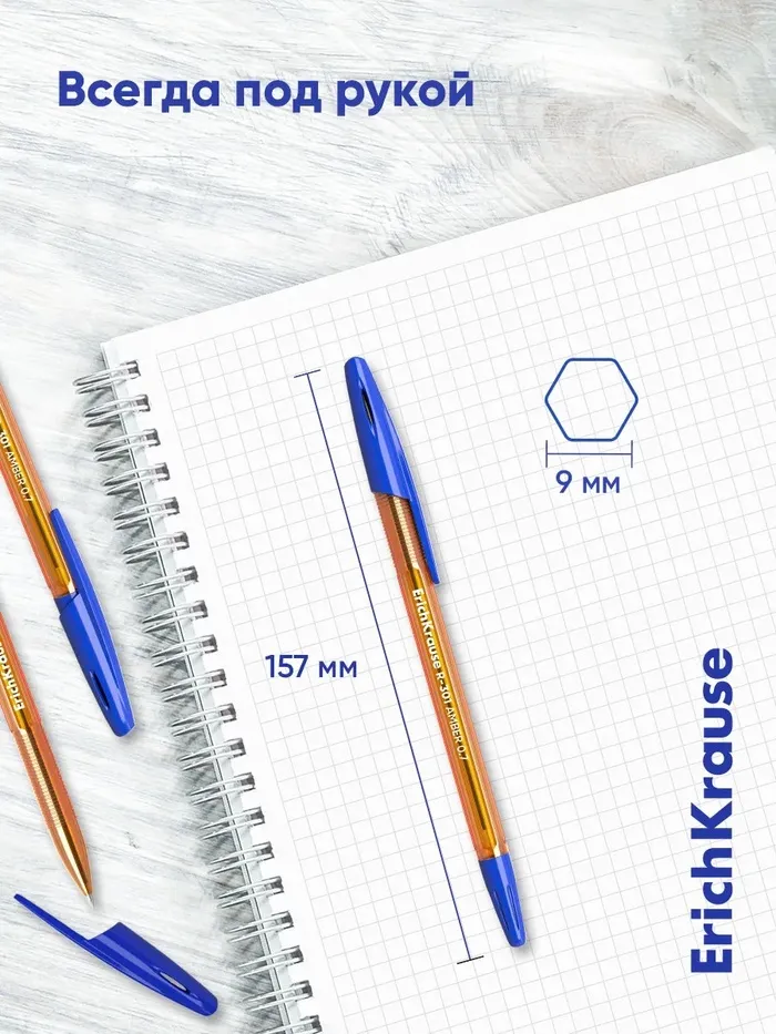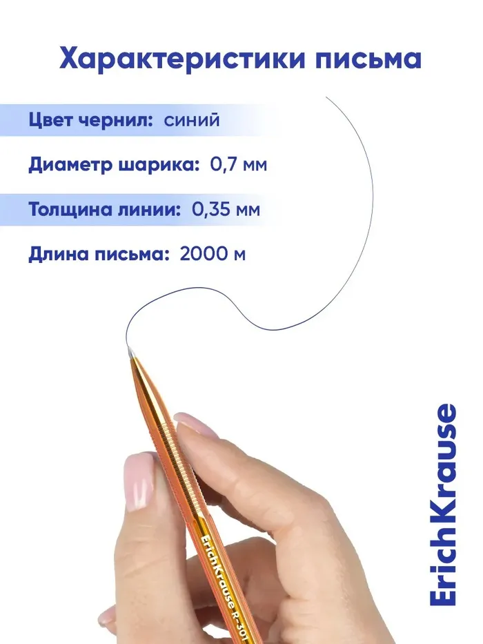 Ручка шариковая ErichKrause R-301 Amber Stick & Grip, узел 0.7 мм, чернила синие, резиновый держатель, длина линии письма 2000 метров — Характеристики