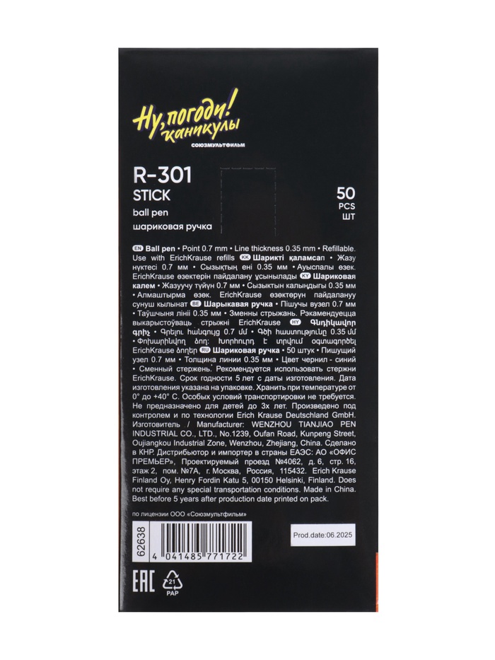 Шариковая ручка в классическом формате R-301 с дизайном «Ну, погоди!» подойдёт тем, кто хочет добавить немного ностальгии в рабочие будни или учёбу. Иллюстрации из знакомого мультфильма создают тёплое настроение, а привычный формат корпуса даёт ощущение надёжности.