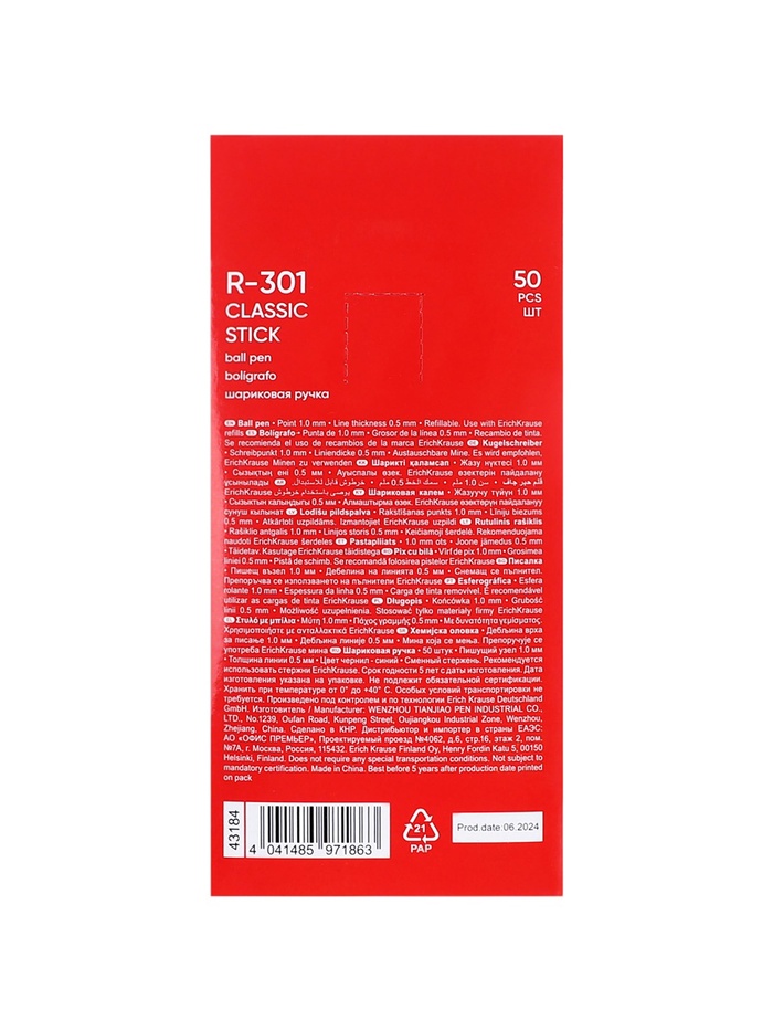 - Модель R-301 Classic 1.0 Stick имеет узнаваемую запатентованную форму и стала абсолютным бестселлером в ассортименте шариковых ручек ErichKrause® более чем в пятидесяти странах мира.