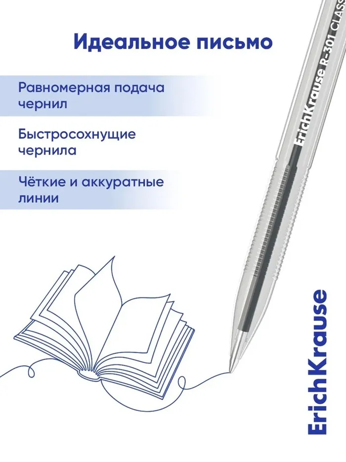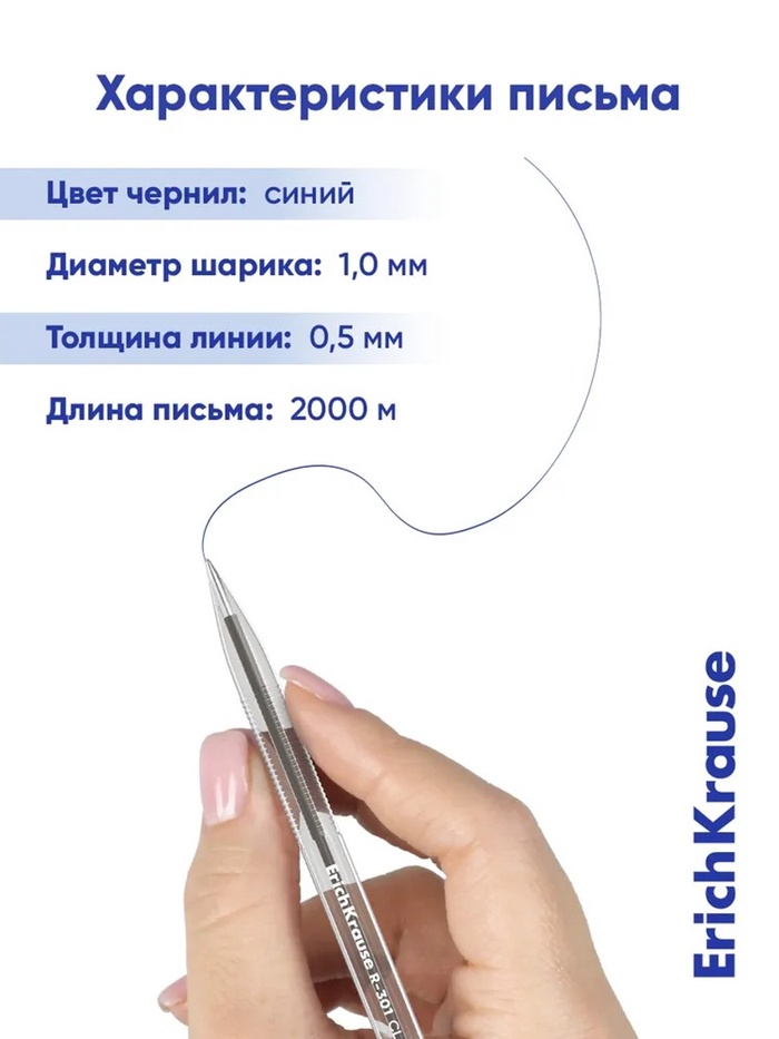 Ручка шариковая ErichKrause R-301 Classic Stick, узел 1.0 мм, чернила синие, длина линии письма 2000 метров, штрихкод на ручке — Характеристики