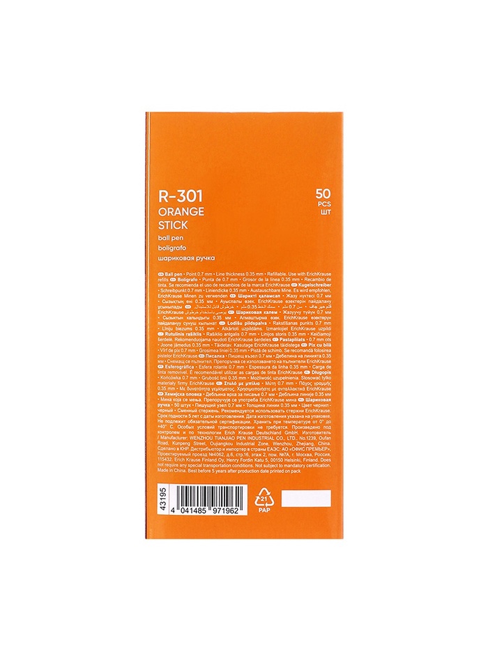 Ручка шариковая ErichKrause R-301 Orange Stick, узел 0.7 мм, чернила чёрные, длина линии письма 2000 метров, штрихкод на ручке — Характеристики