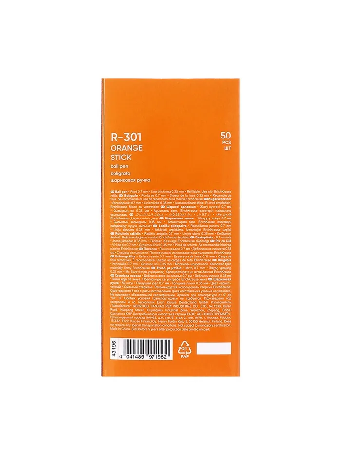 Классическая шариковая ручка Stick со стандартным типом пишущего узла и заменяемым стержнем. 5-канальный пишущий узел с диаметром шарика 0.7 мм в сочетании с быстросохнущими чернилами обеспечивает мягкое и быстрое письмо. Длина непрерывной линии составляет 2000 м при толщине 0.35 мм, что является одним из лучших показателей в своей категории. Модель R-301 Stick Orange 0.7 имеет узнаваемую запатентованную форму и стала одним из бестселлеров в ассортименте шариковых ручек ErichKrause более чем в пятидесяти странах мира.