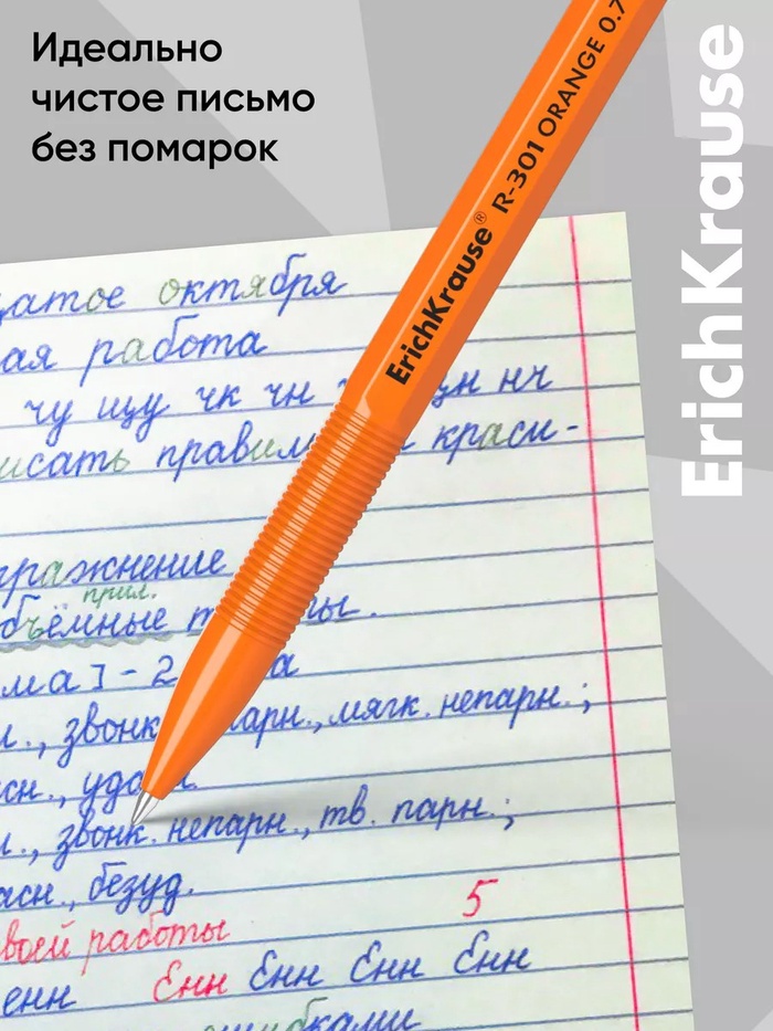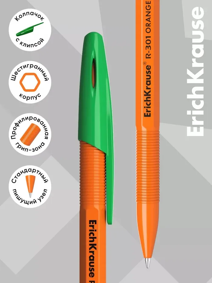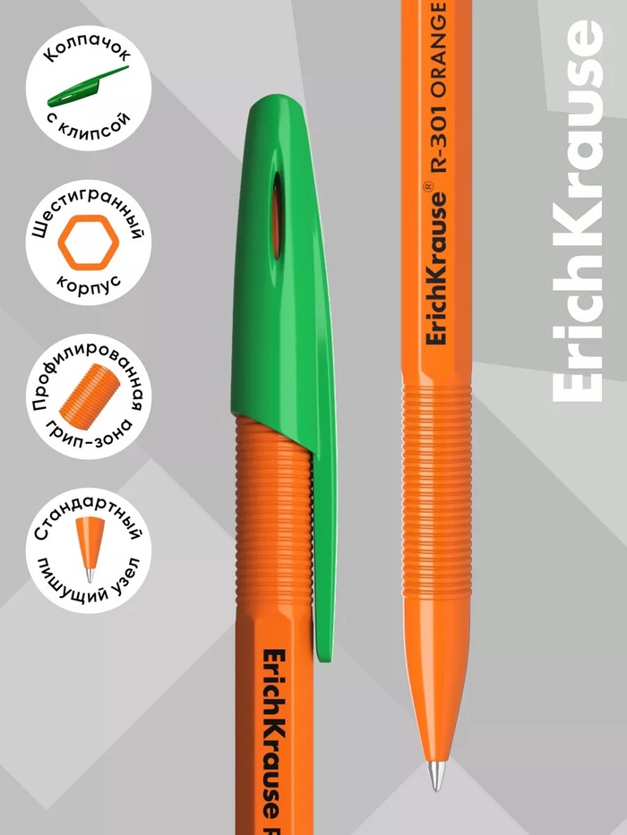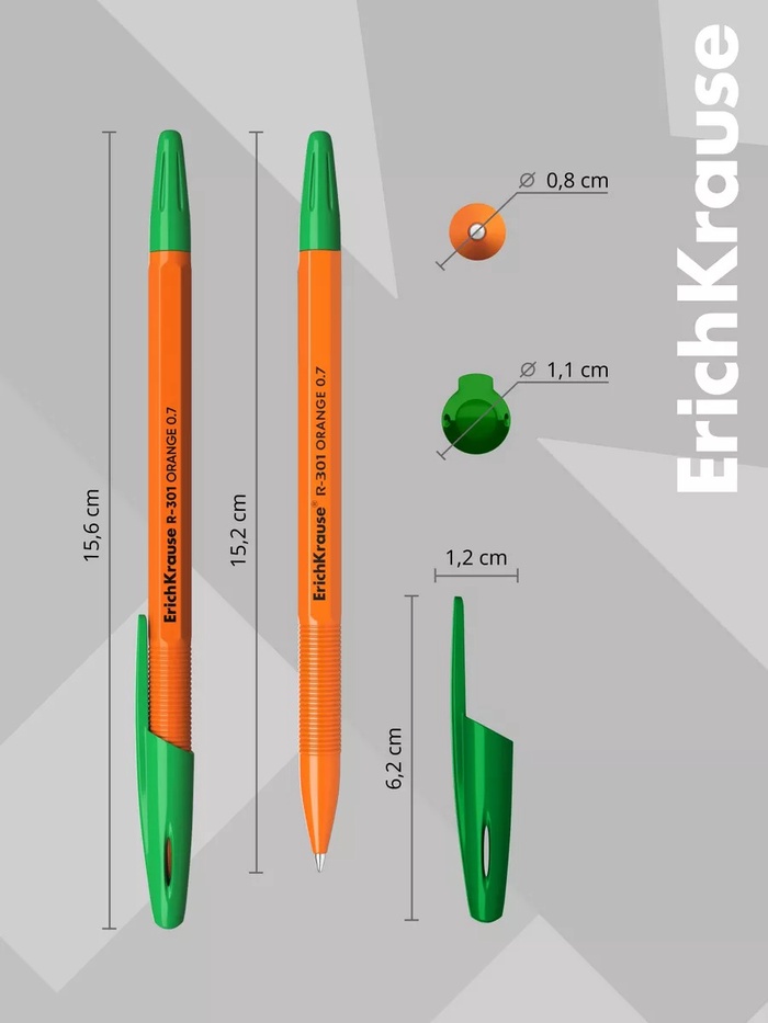 Ручка шариковая ErichKrause R-301 Orange Stick, узел 0.7 мм, чернила зелёные, длина линии письма 2000 метров, штрихкод на ручке — Характеристики