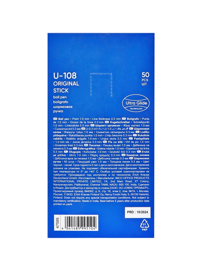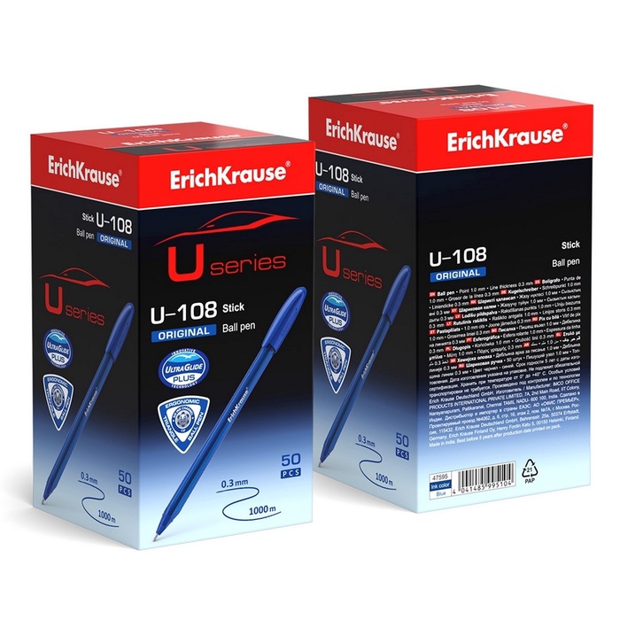 Ручка шариковая ErichKrause U-108 Original Stick, узел 1.0 мм, чернила синие, супермягкое письмо, длина линии письма 1000 метров — Характеристики