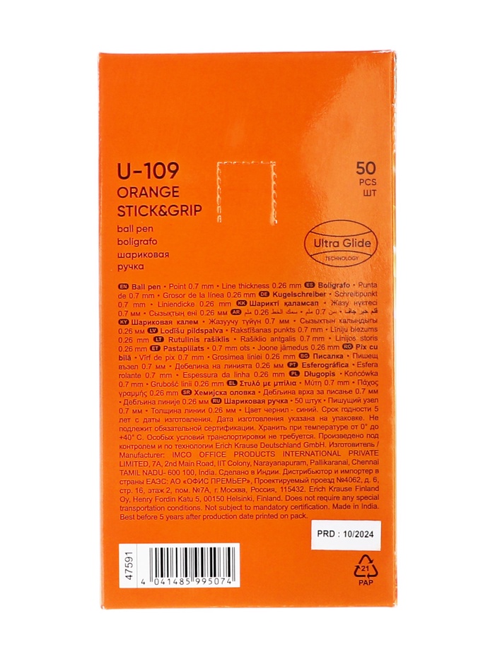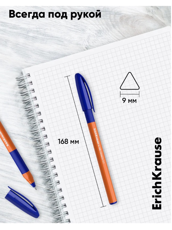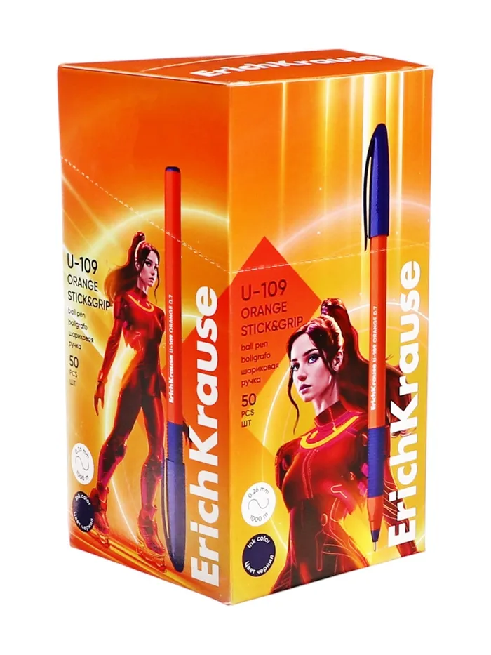 • Ручка шариковая ErichKrause U-109 Orange Stick&Grip, игольчатый узел 1.0 мм, чернила синие, резиновый держатель, супермягкое письмо — Характеристики
