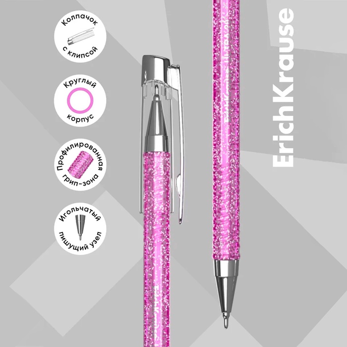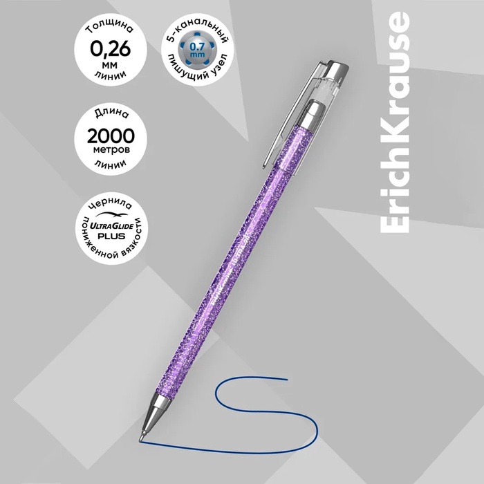 Ручка шариковая ErichKrause ULTRA-20 Stick Glitter, узел 0.7 мм, чернила синие, длина линии письма 2000 метров — Характеристики