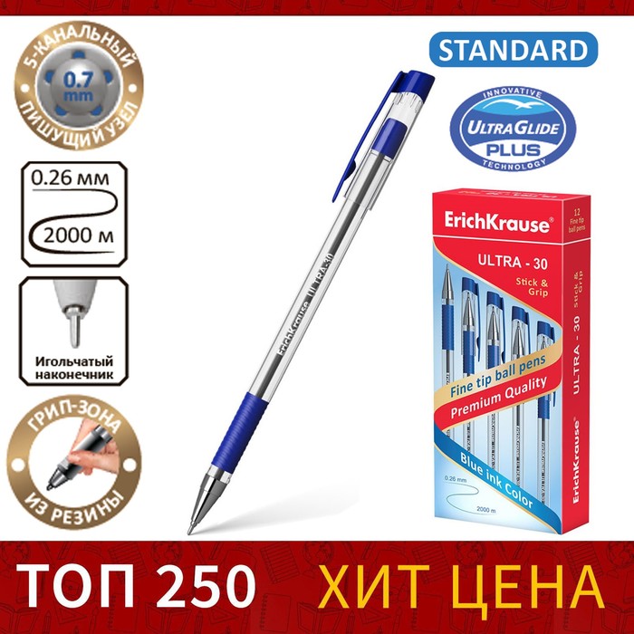 Классическая шариковая ручка Stick&Grip с металлизированным наконечником, утонченным игольчатым типом пишущего узла Fine tip и заменяемым стержнем. Ручка имеет прозрачный круглый корпус с удобной профилированной грип-зоной из резины. Цвет грип-зоны, колпачка и заглушки соответствует цвету чернил. 5-канальный пишущий узел с диаметром шарика 0.7 мм в сочетании с чернилами пониженной вязкости обеспечивает точное и быстрое письмо. Длина непрерывной линии составляет 2000 м при толщине 0.26 мм, что является высоким показателем в своей категории.
