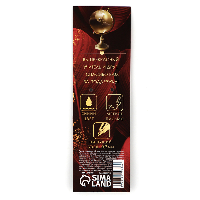 Ручка шариковая, пластик, с тиснением на корпусе, синяя паста, 0.7 мм «Вы учитель №1» — Характеристики