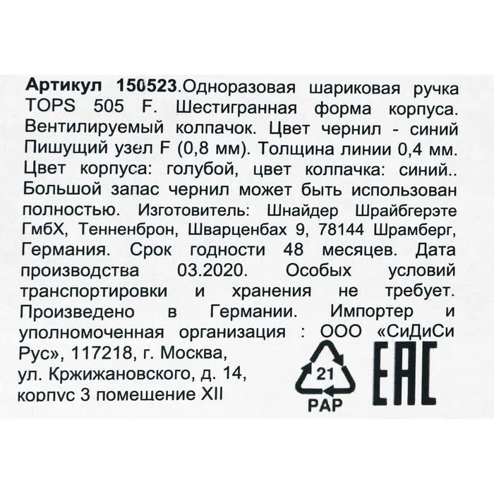 Ручка шариковая Schneider Tops 505 F, узел 0.8 мм, синие чернила, корпус голубой — Характеристики