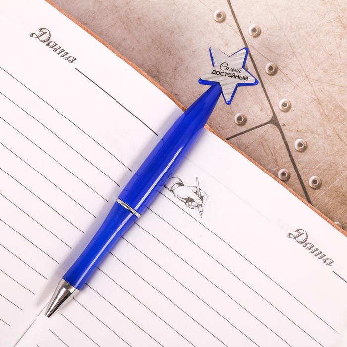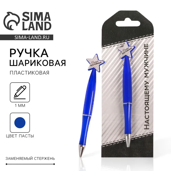 Ручка шариковая, синяя паста, пластик, со звездой, на подложке- погон «Настоящему мужчине» — Характеристики