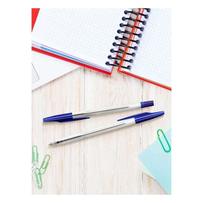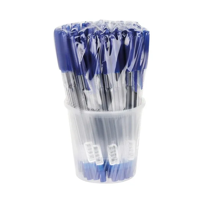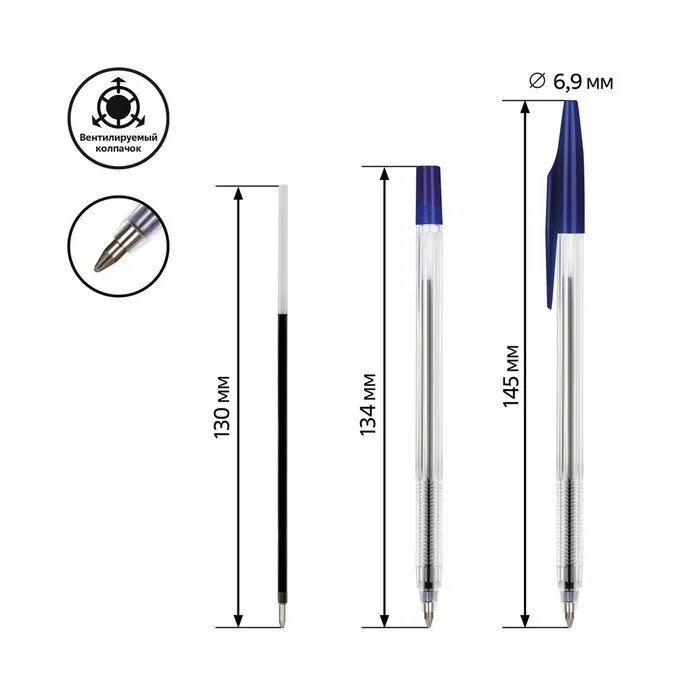 Ручка шариковая с синим стержнем. Вентилируемый колпачок надёжно фиксируется на корпусе ручки. Специальные насечки на корпусе для удобного захвата. Синие чернила на масляной основе. Толщина линии письма 0,7 мм. Длина стержня 130 мм. На каждой ручке имеется штрихкод.