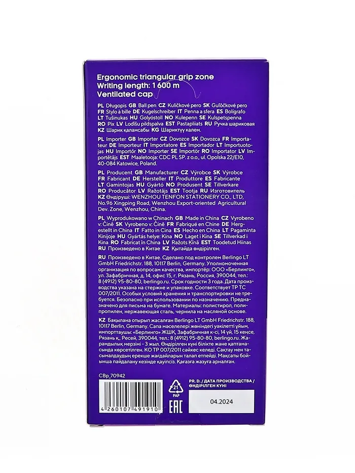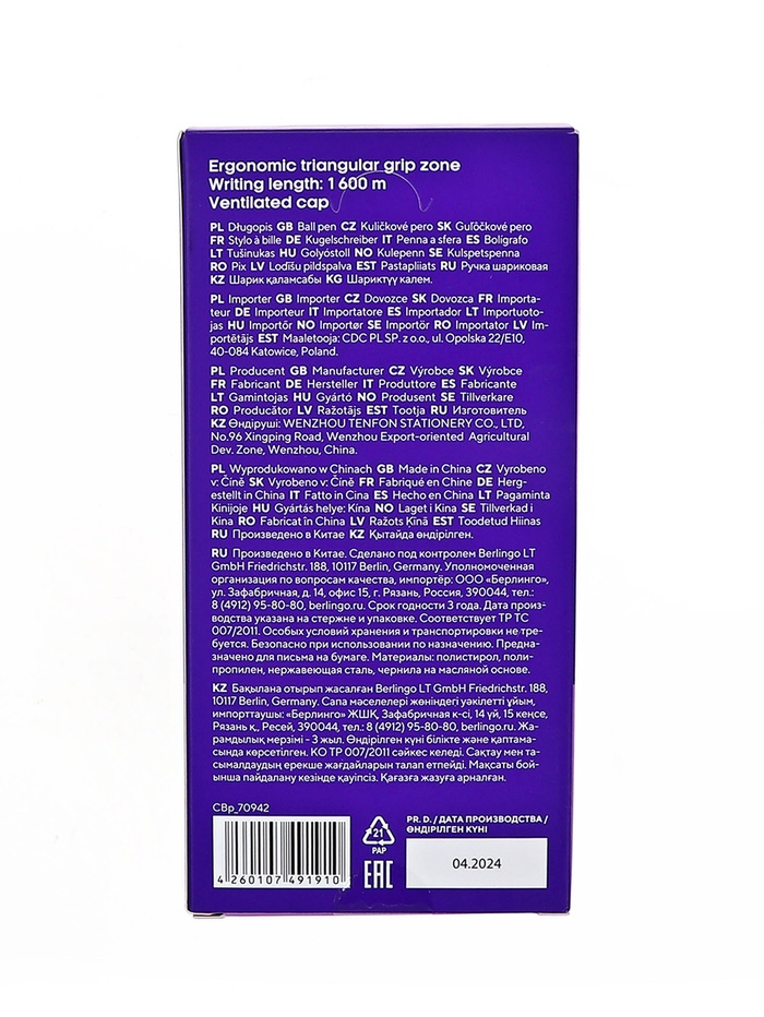 Шариковая ручка Berlingo Tribase Pastel в нежных, пастельных тонах с вентилируемым колпачком, который обеспечивает безопасность при использовании детьми, это стильный аксессуар для работы или учёбы. Пластиковый клип позволит разместить ручку где удобно. Эргономичная трёхгранная зона захвата с рифлением препятствует скольжению пальцев. Качественные чернила обеспечивают чёткое и ровное письмо. Диаметр пишущего узла составляет 0,7 мм, благодаря чему ручка прекрасно подходит для любого стиля письма. Толщина линии письма составляет 0,5 мм, а длина линии письма составляет 1200 метров. Цвет чернил: синий, Толщина линии письма: 0,5 мм, Длина линии письма: 1200 м, Цвет корпуса: микс из 5-ти цветов.